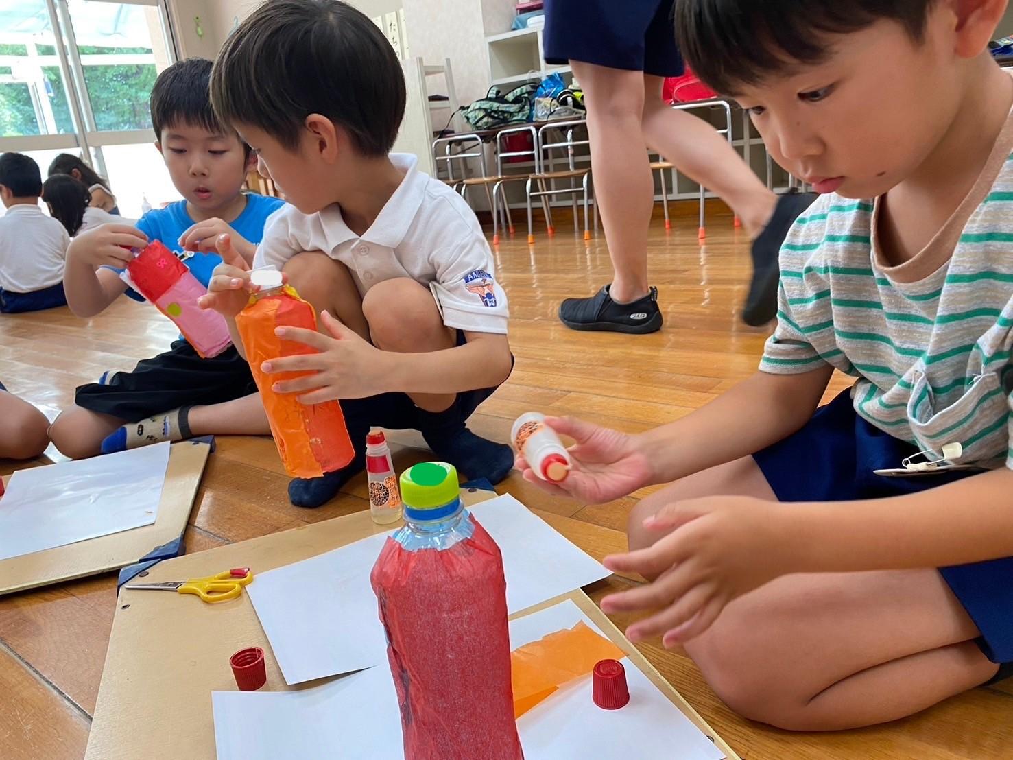 持ってきたペットボトルに飾り付けをしました。