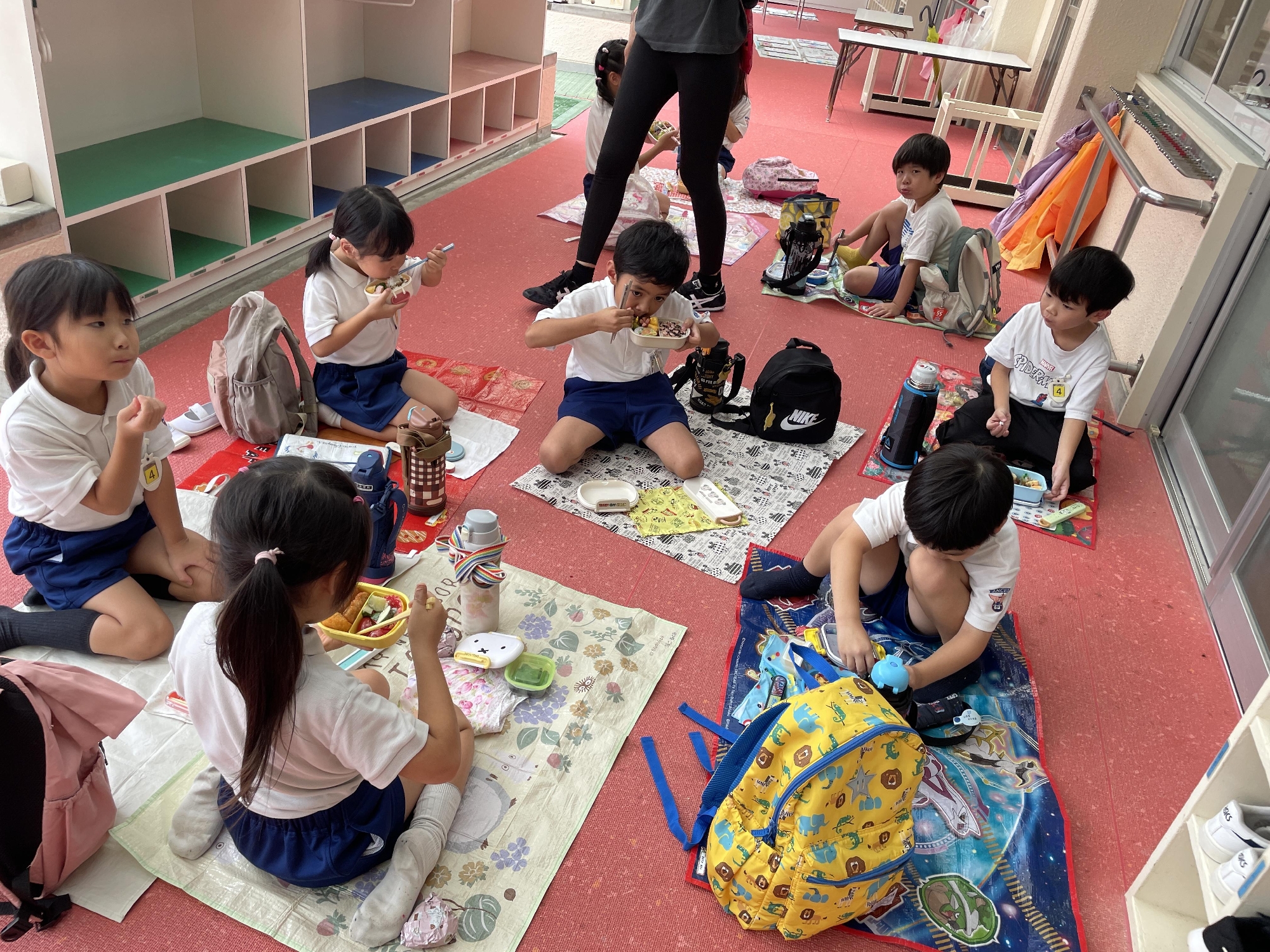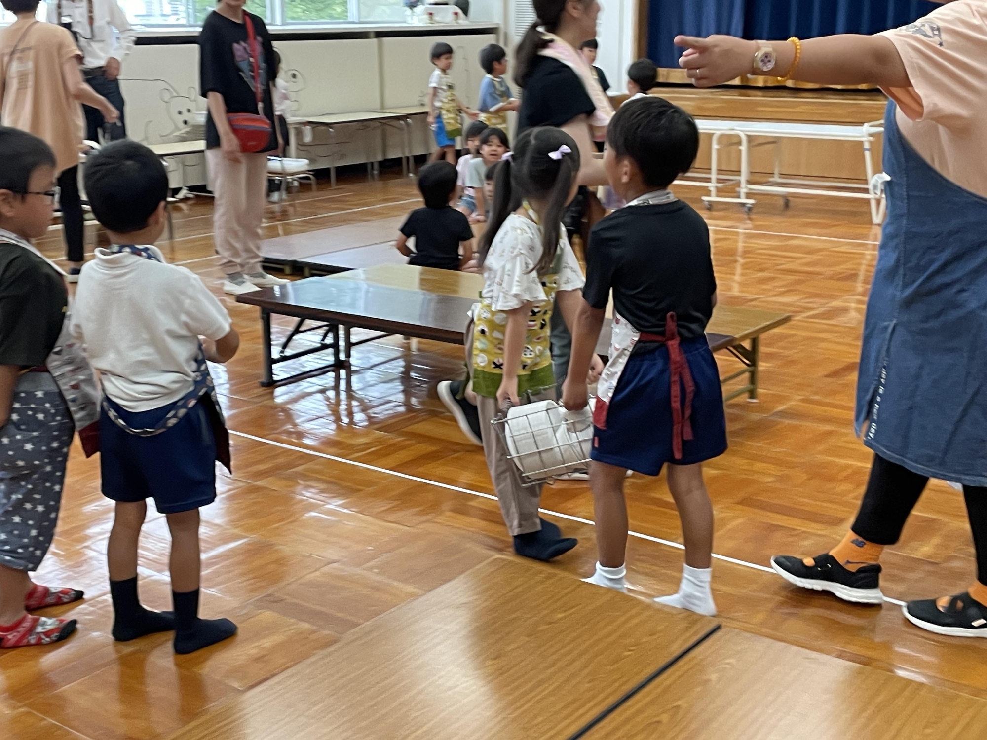 班の番号を聞いて集まったり、いつもと違う友だち、先生と一緒に過ごします。
