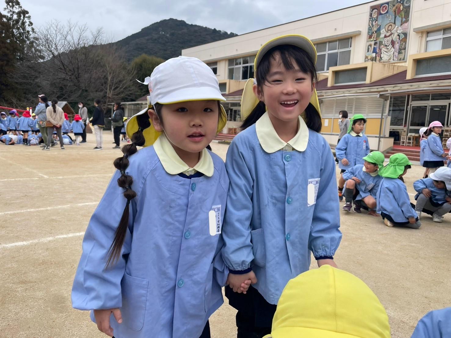 まずは年長児と、半分の年中児が隠れ、手をつなぐお友達が探しに行きました。2回戦は逆になり、最初に隠れたお友達が探しました。迷子になるお友だちは白帽子、探すお友だちはカラー帽子。