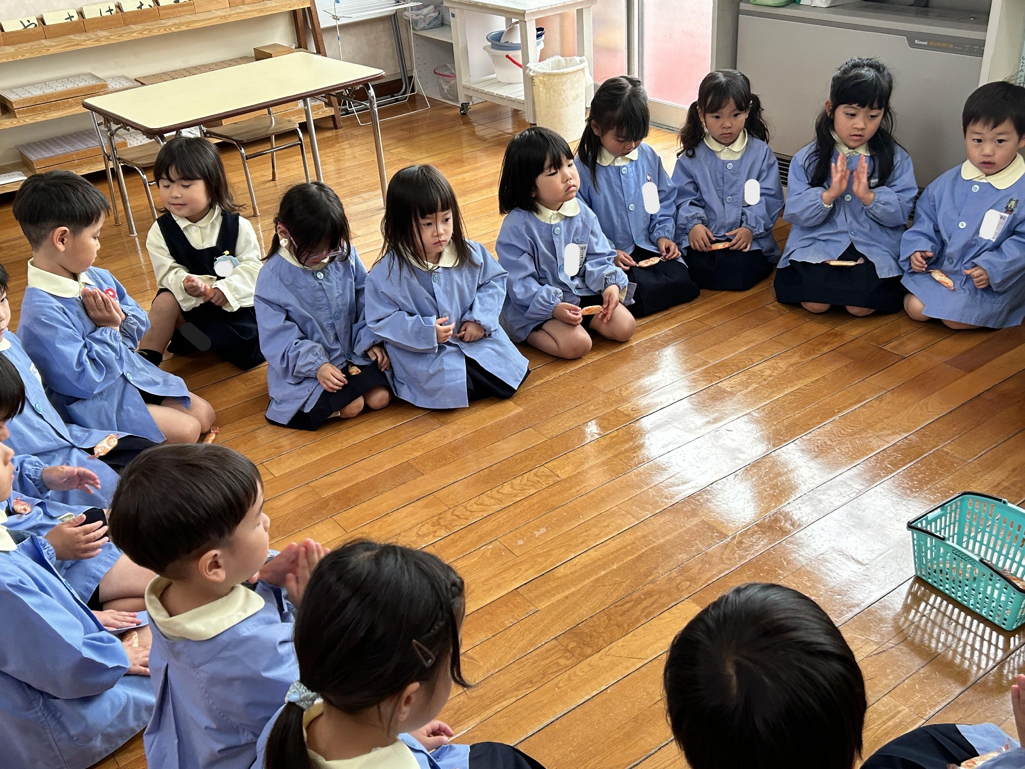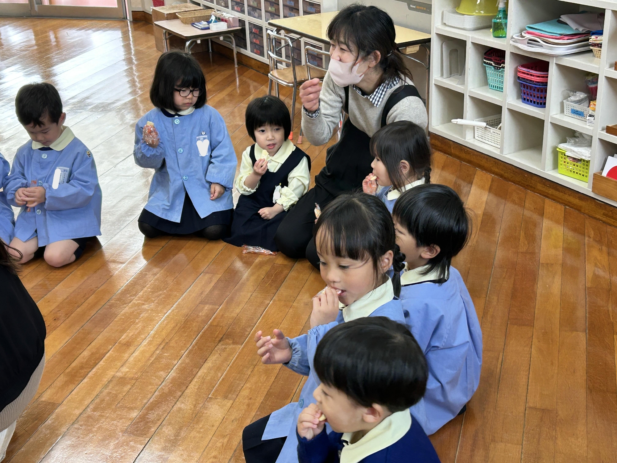 かごから一つ取ってお隣の友達に「どうぞ」と渡してあげる子もいました。