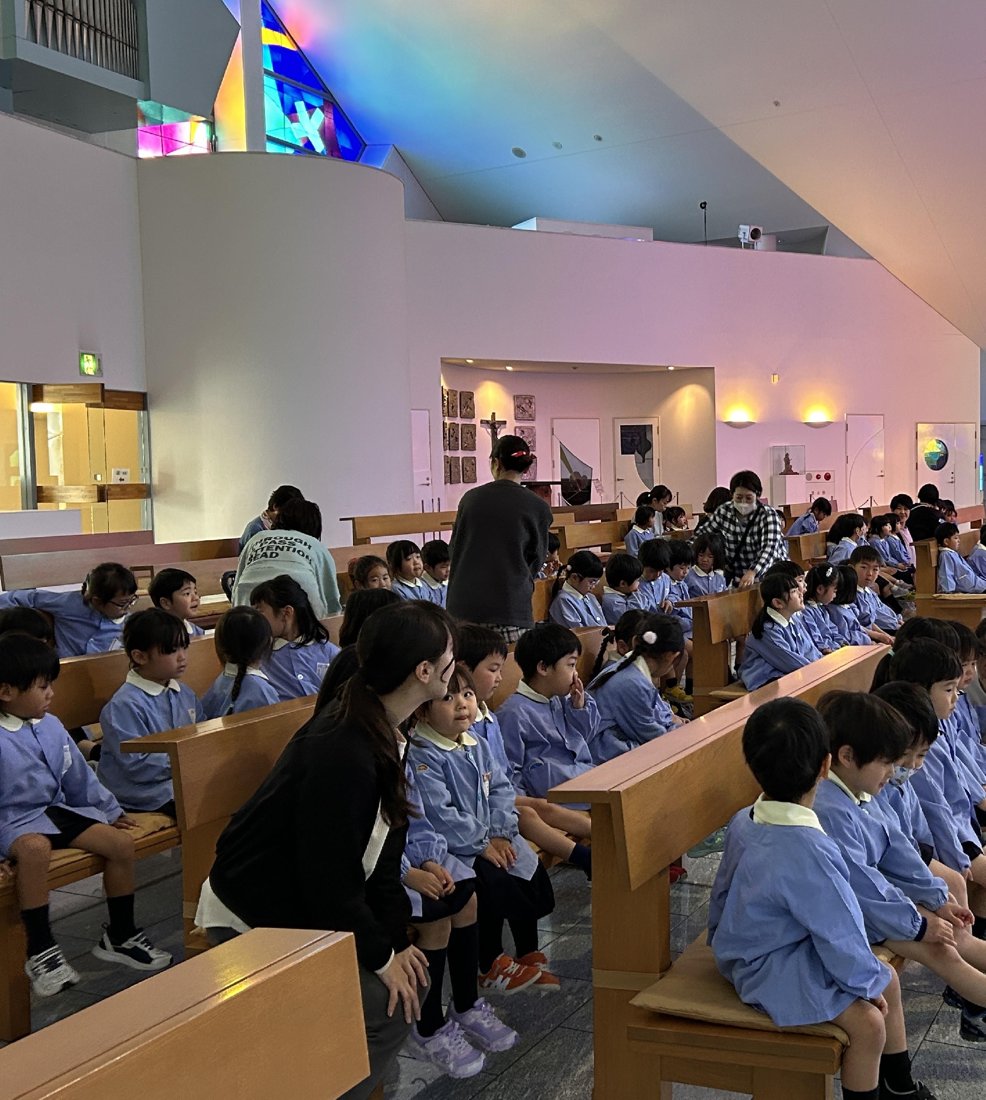 教会に入ると、きれいなステンドグラスやパイプオルガンのパイプが見えて子ども達は、嬉しそうにキョロキョロしながら座りました。