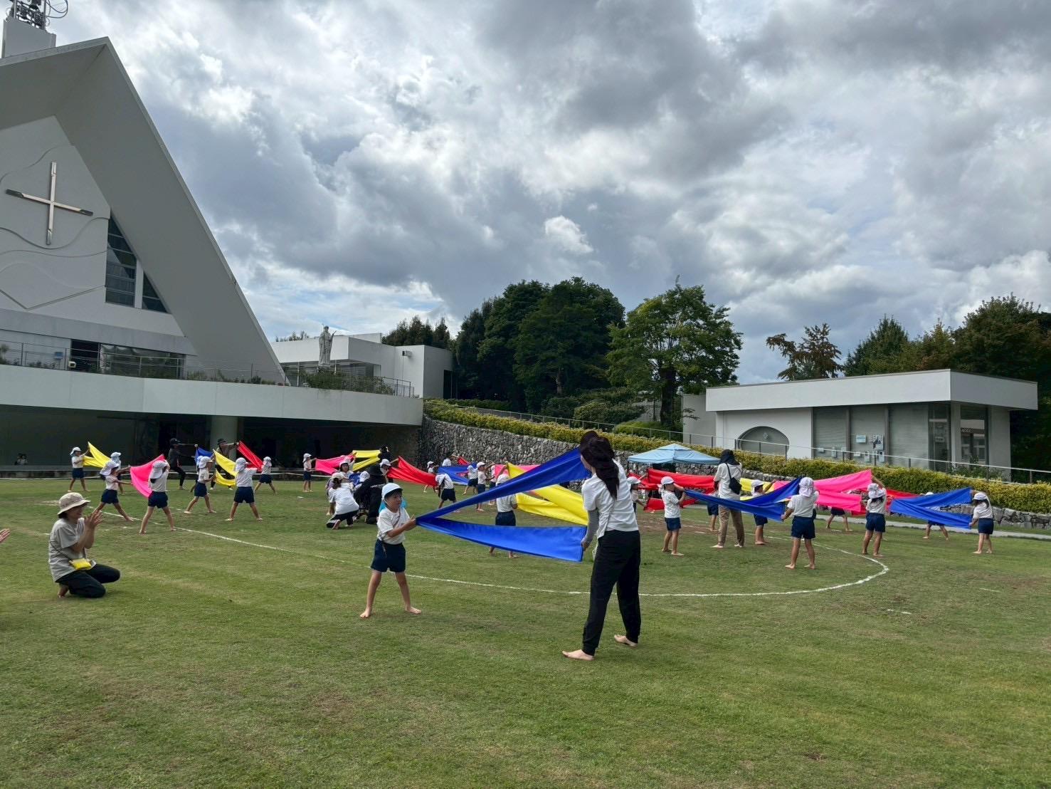 表現体操では、大阪万博「いのち輝く」から、「つながるいのち」をテーマに子ども達と動きや名前を考えて作り上げています。