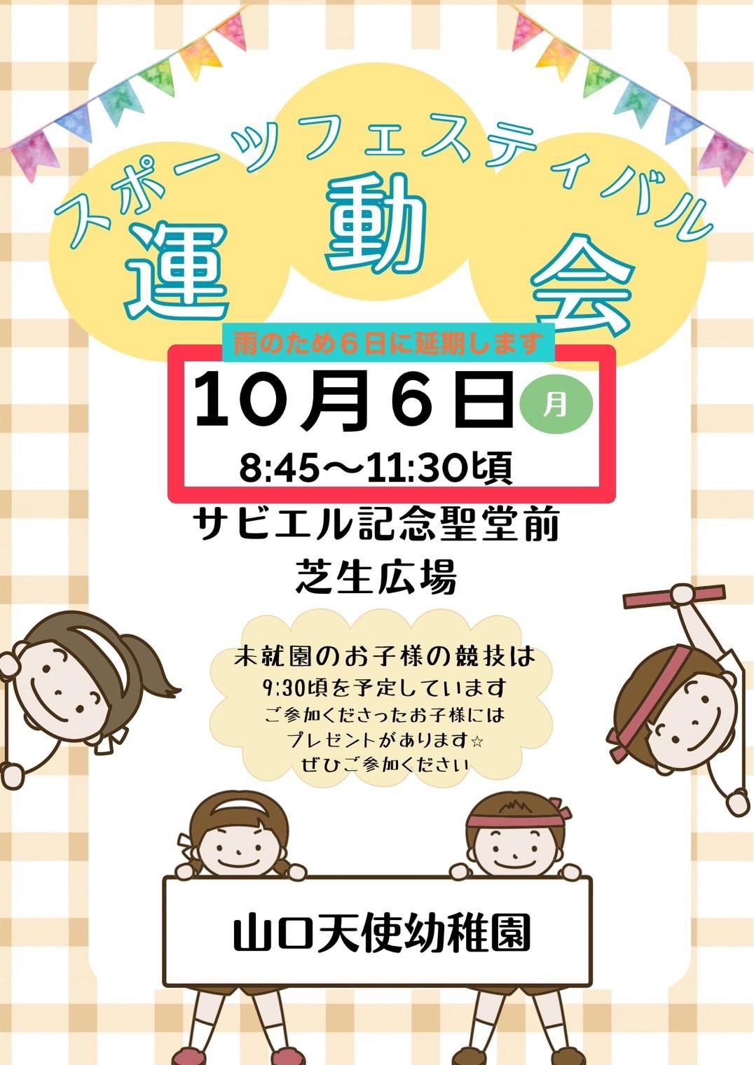 スポーツフェスティバルを土曜日に開催できるように子ども達と一緒にお祈りしていましたが、週末にかけて雨の予報が出ているため、10月6日(月)に延期させていただきます。ご迷惑をおかけします。