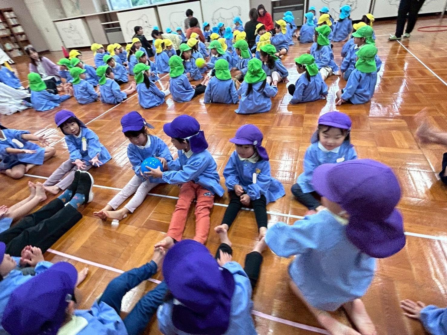 最初、4クラスずつに分かれてホールに集まって、「君へ贈る応援歌」体操と、スポーツフェスティバルで楽しんだ、「ボールおくり」をしました。