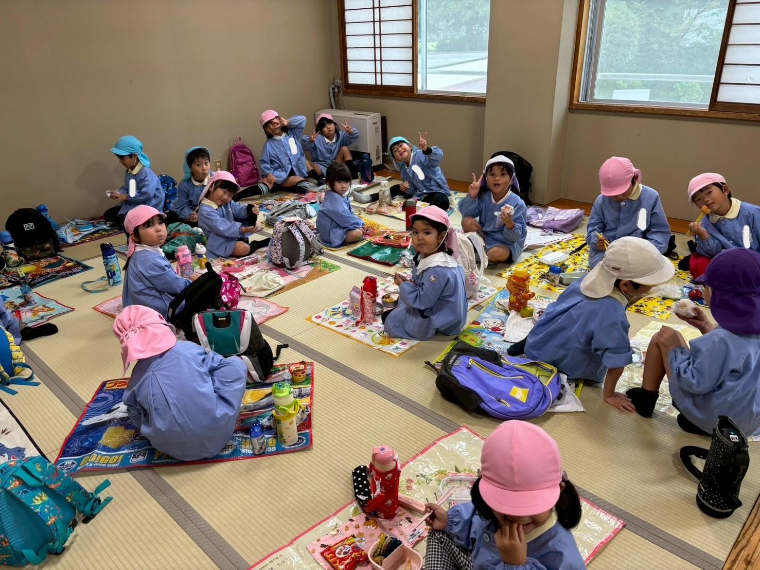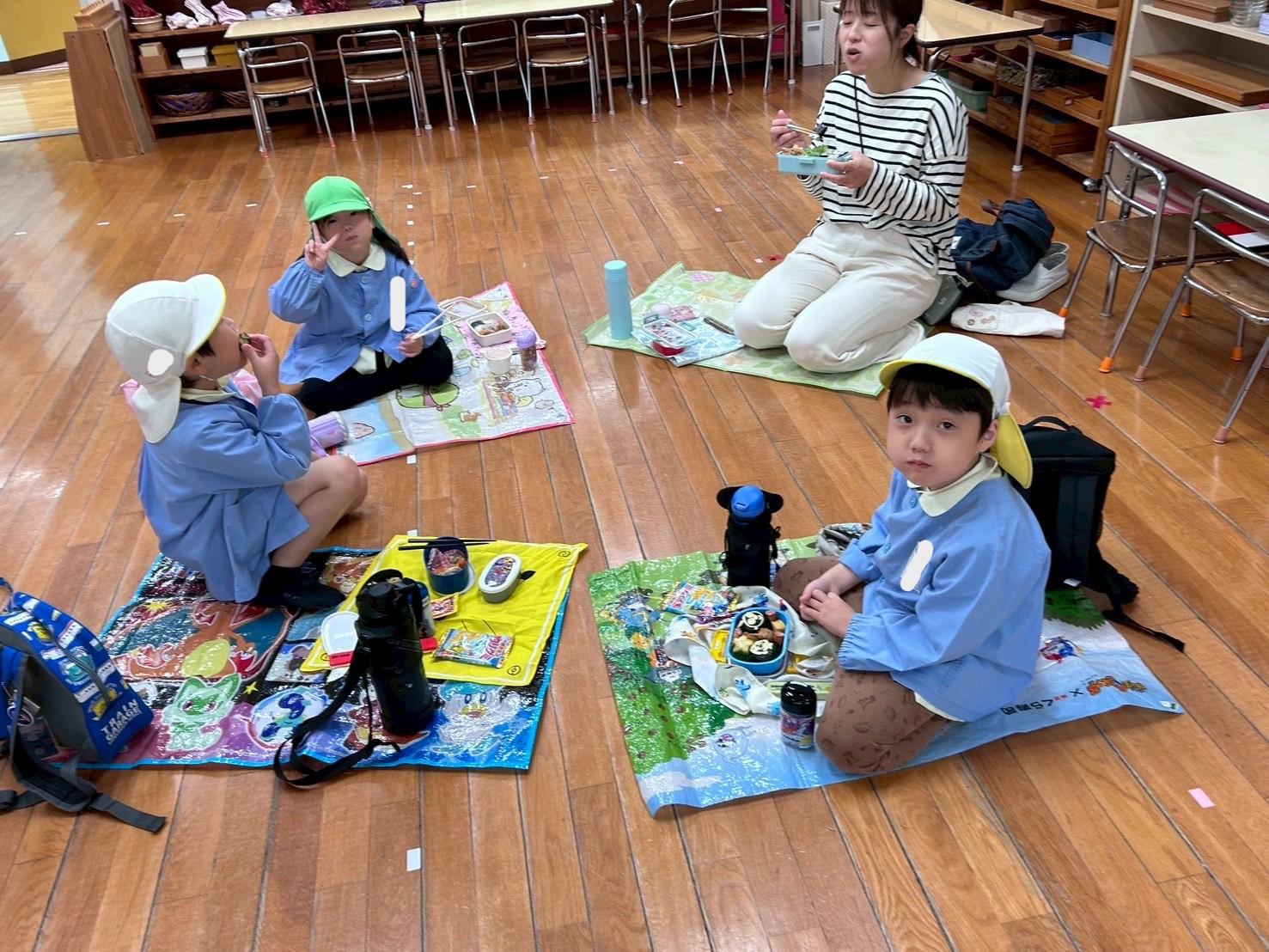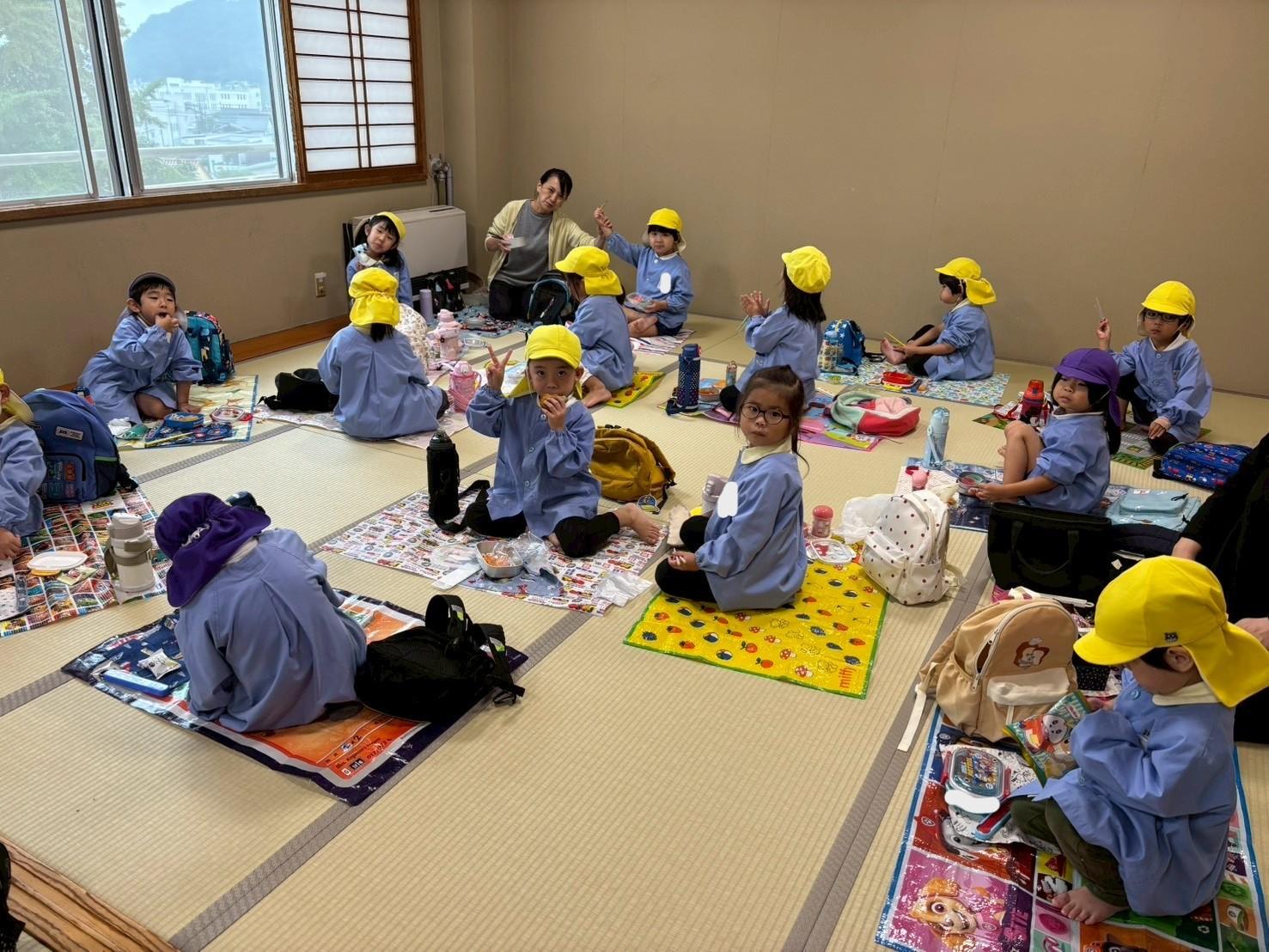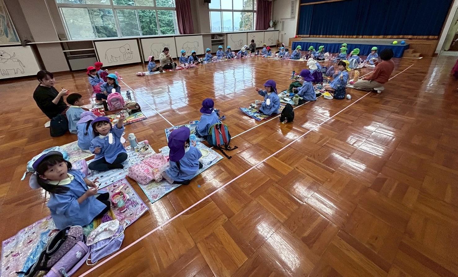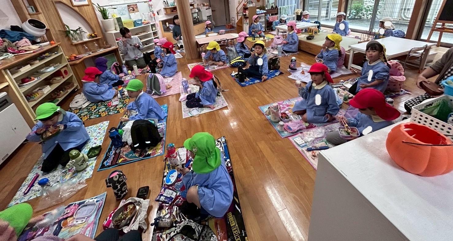 その後、リュックを持って各クラス、ホール、もちのき、もりのいえ、てんし組の中から、好きな所を選んで弁当とおやつを食べに行きました。特に、てんし組が人気で、沢山の子ども達が弁当を食べていました。