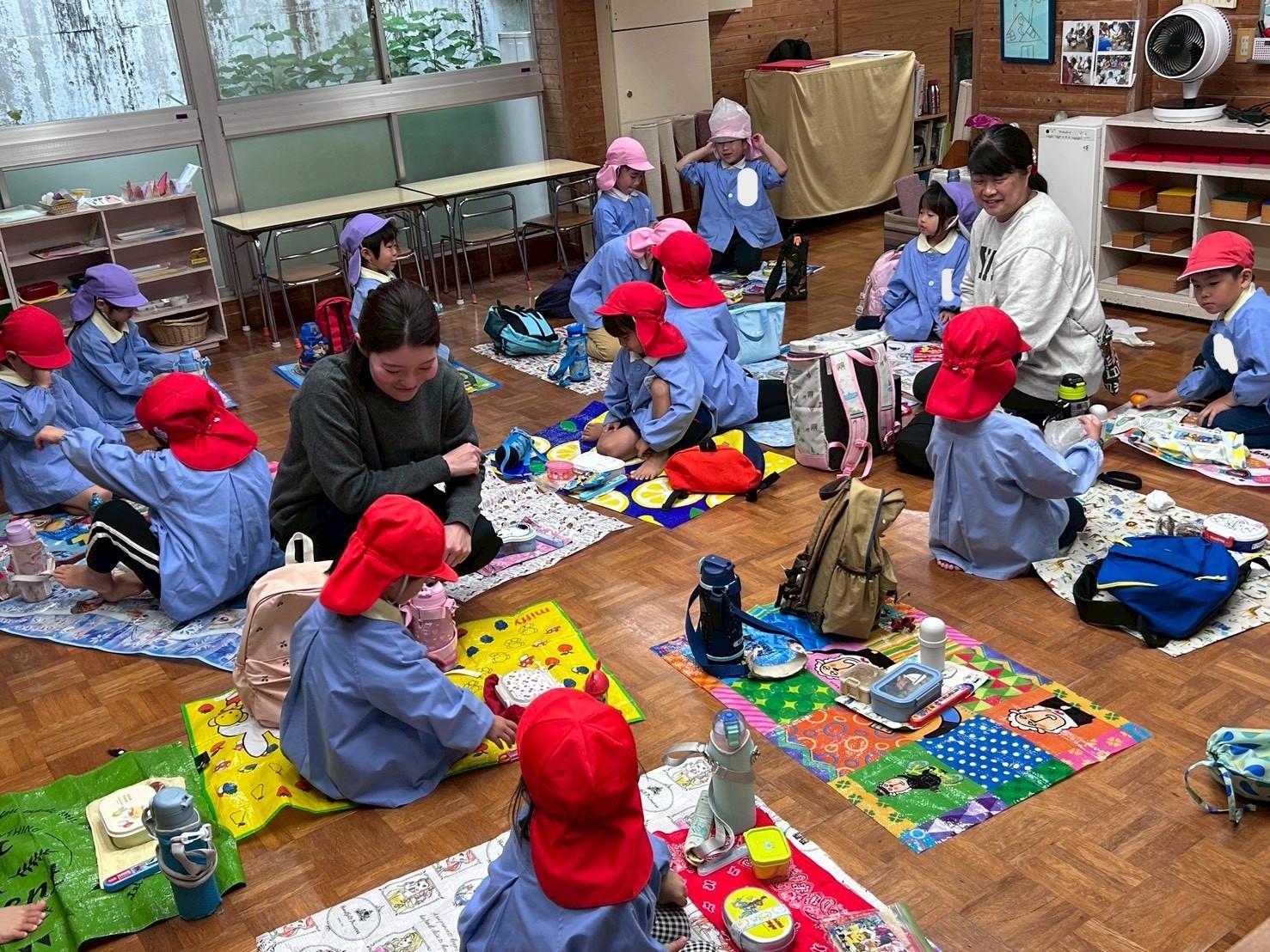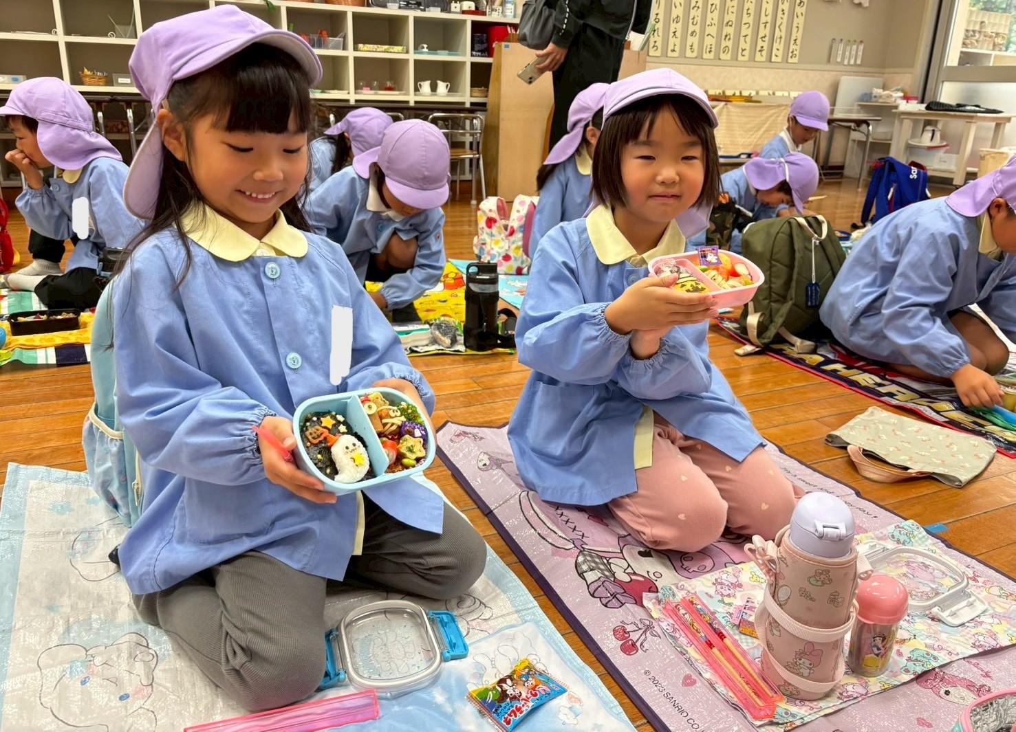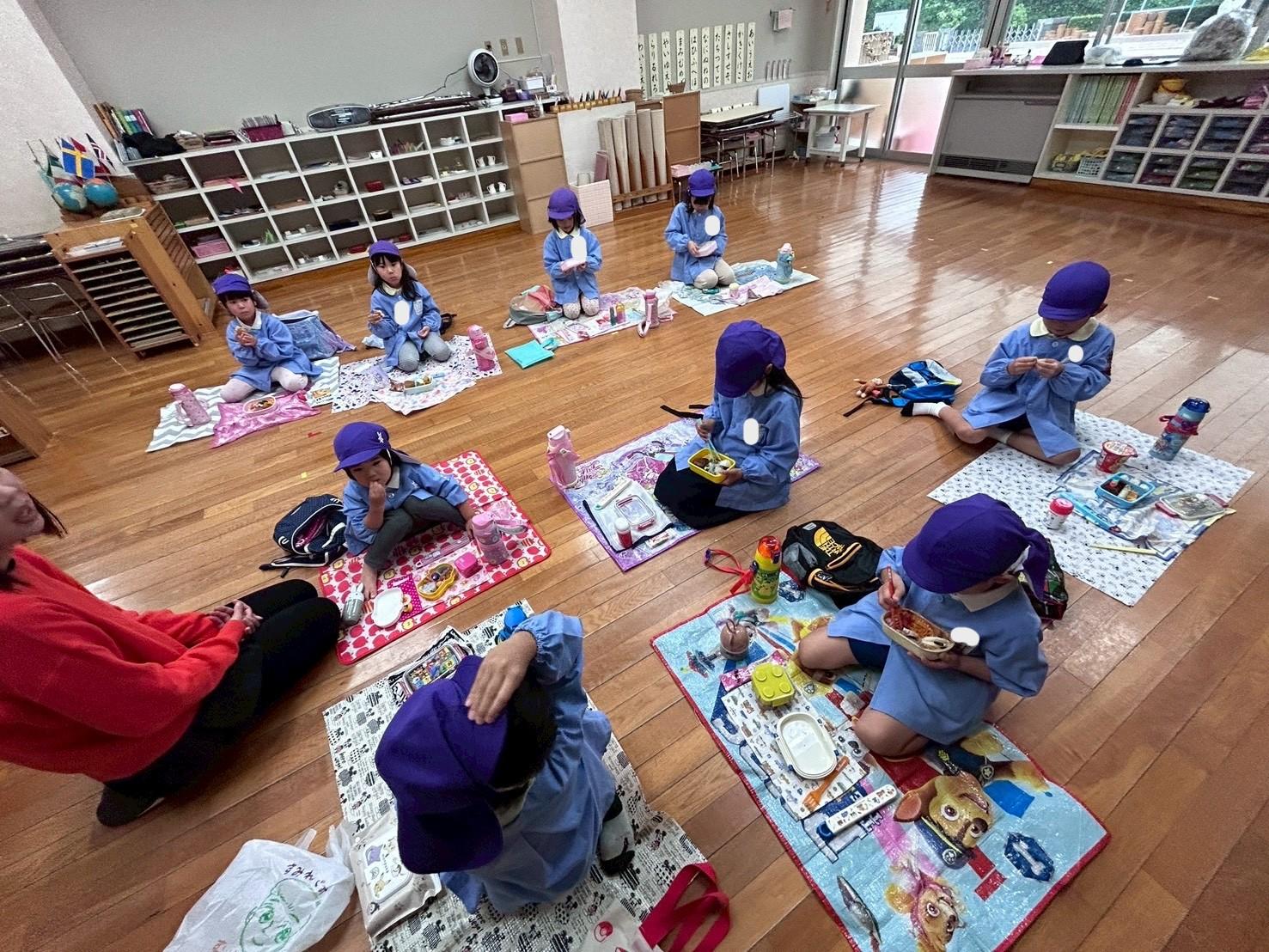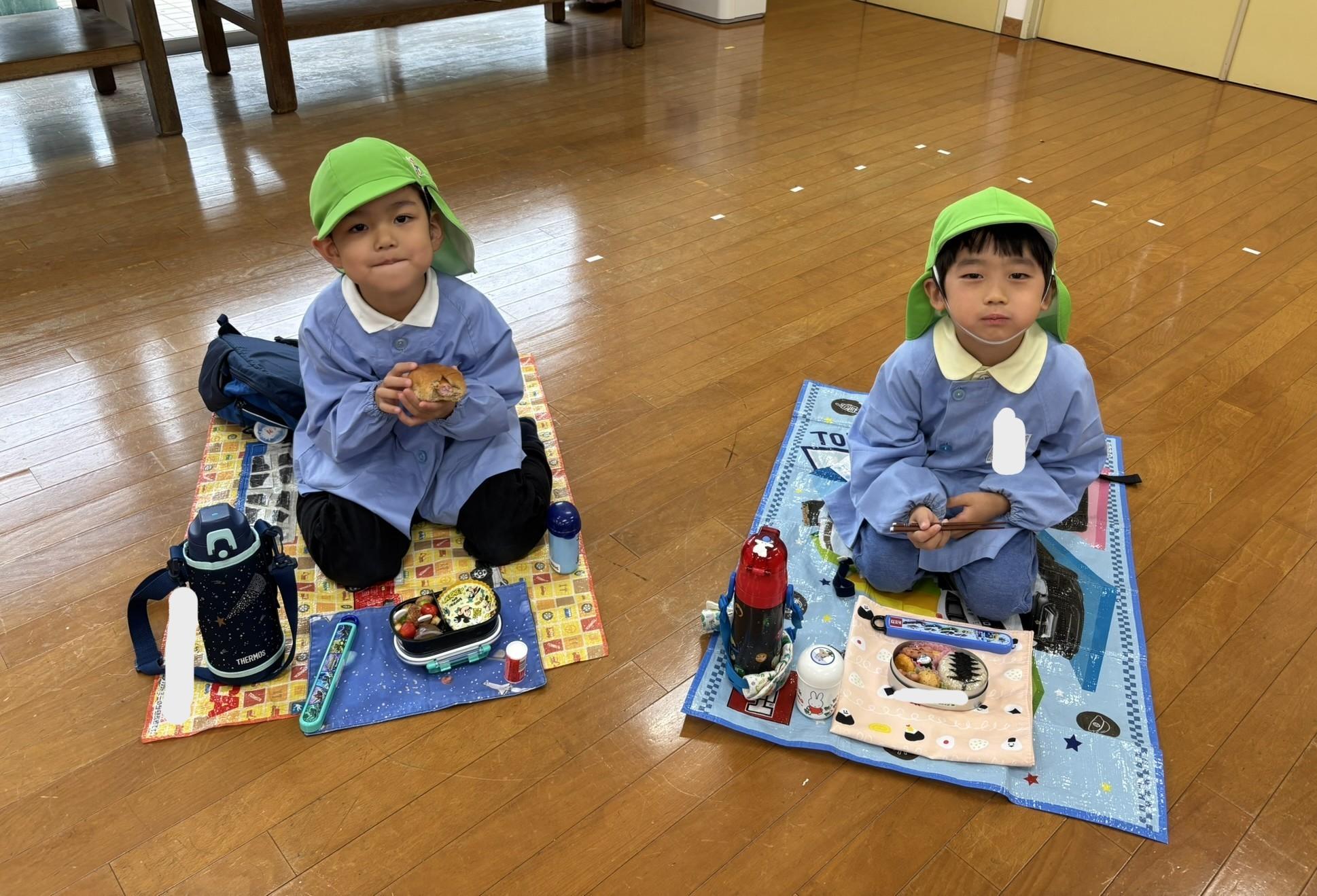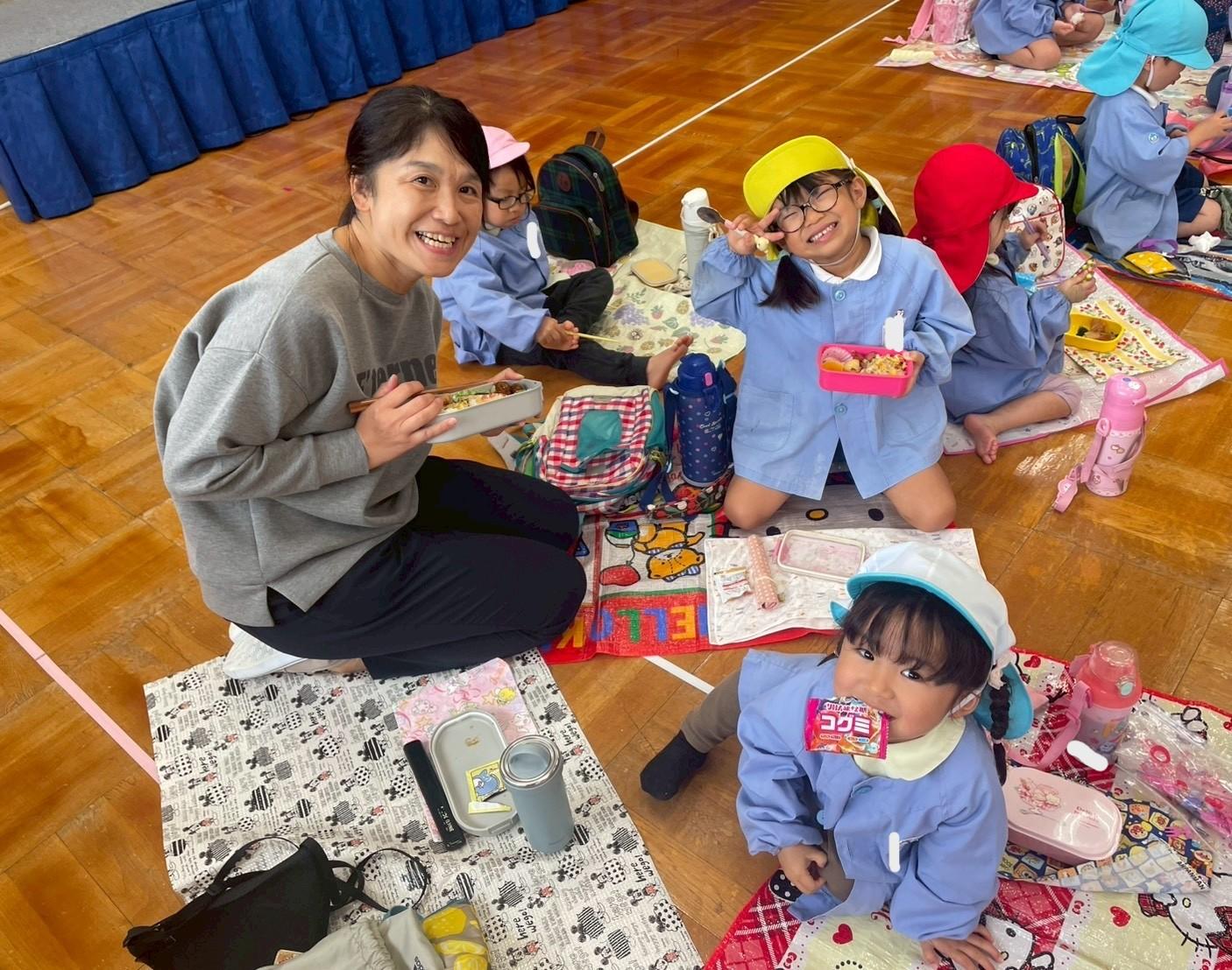 その後、リュックを持って各クラス、ホール、もちのき、もりのいえ、てんし組の中から、好きな所を選んで弁当とおやつを食べに行きました。特に、てんし組が人気で、沢山の子ども達が弁当を食べていました。