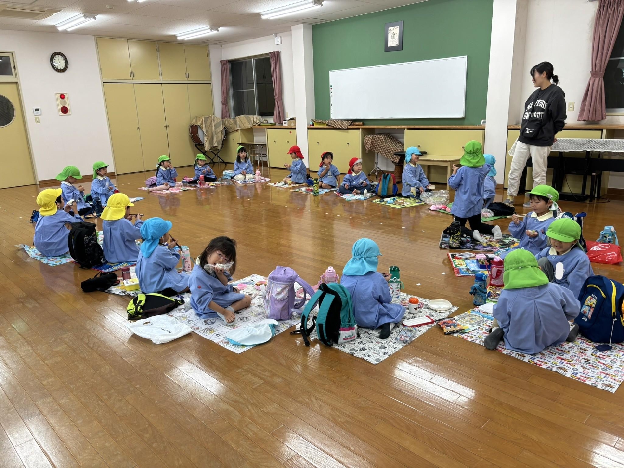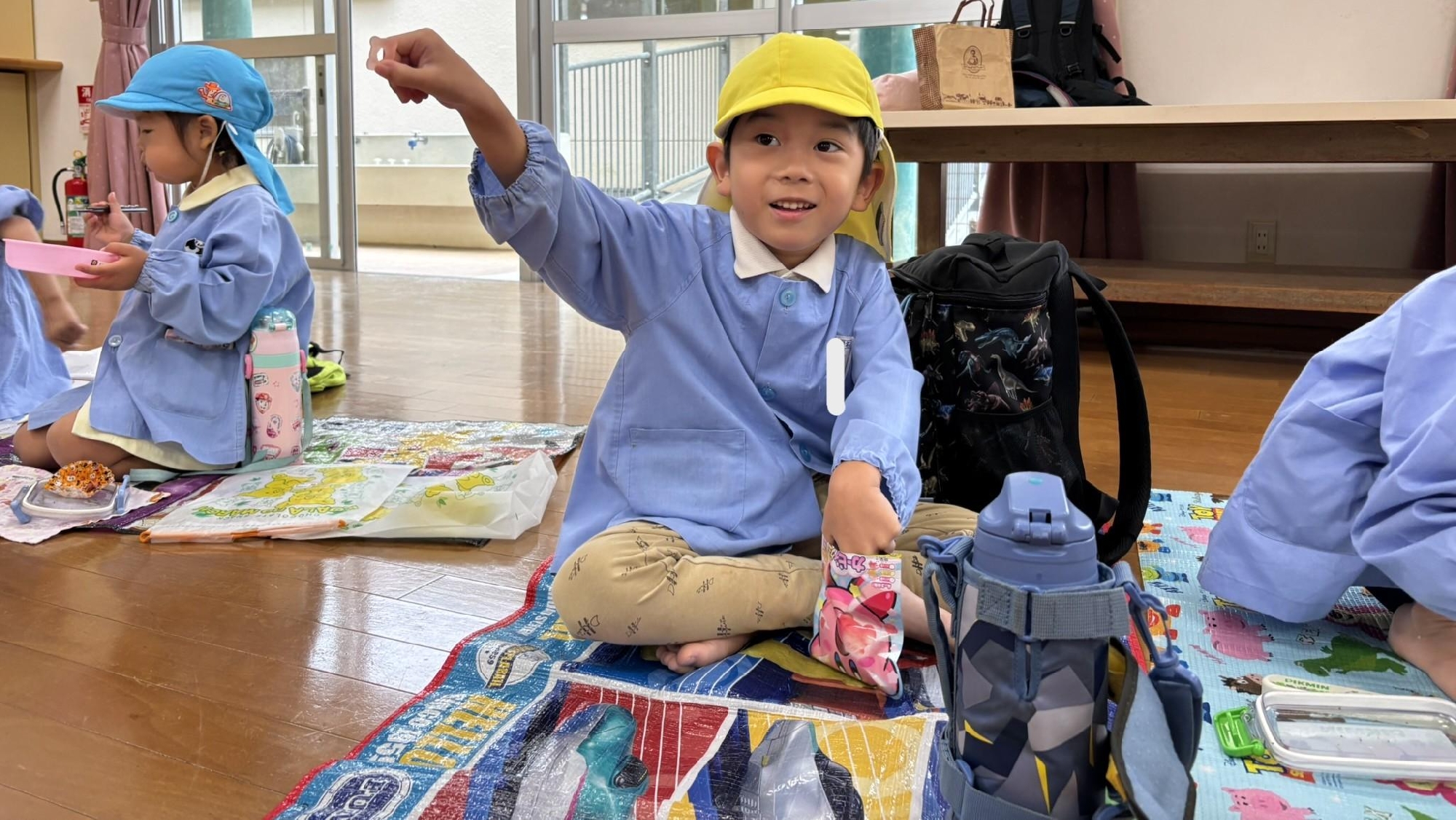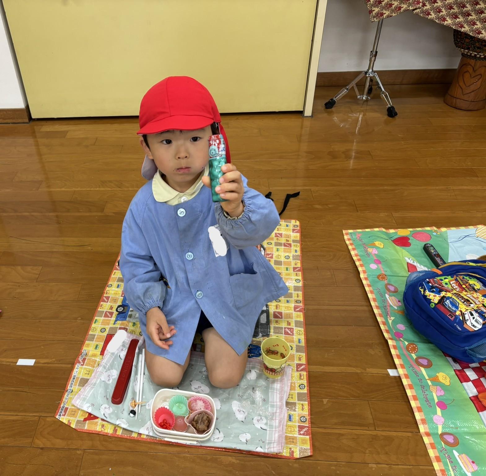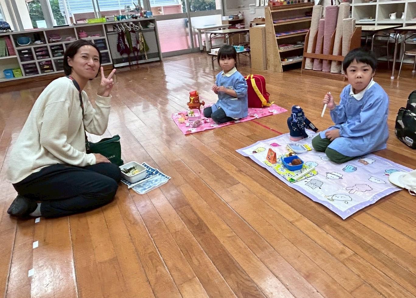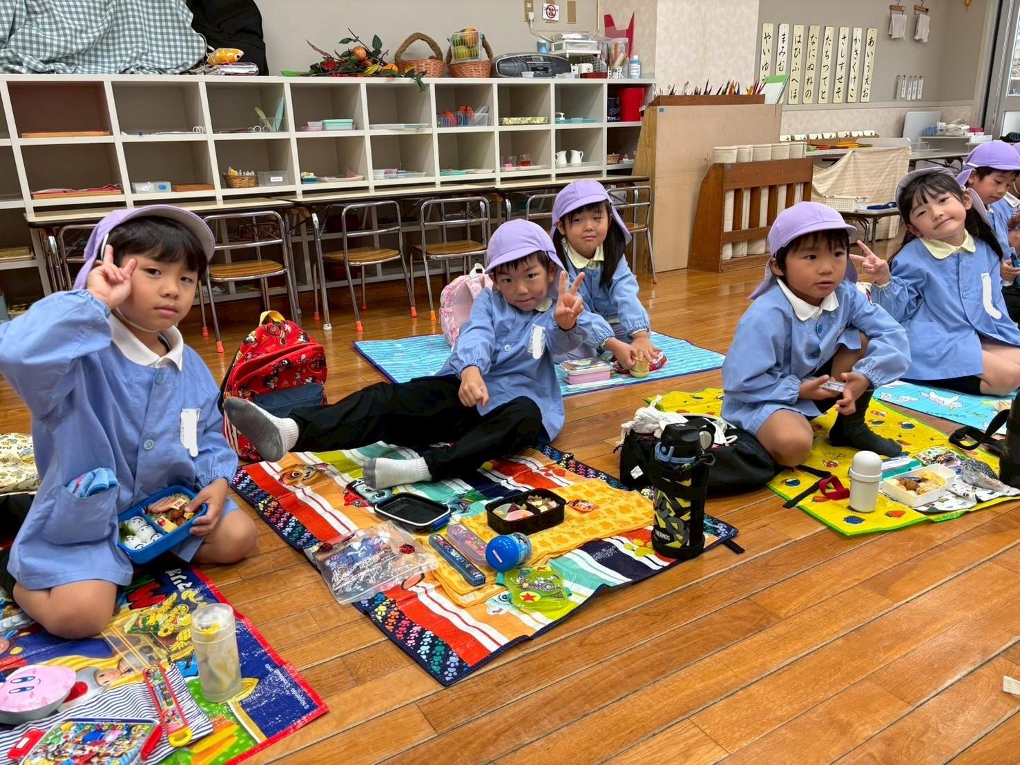その後、リュックを持って各クラス、ホール、もちのき、もりのいえ、てんし組の中から、好きな所を選んで弁当とおやつを食べに行きました。特に、てんし組が人気で、沢山の子ども達が弁当を食べていました。