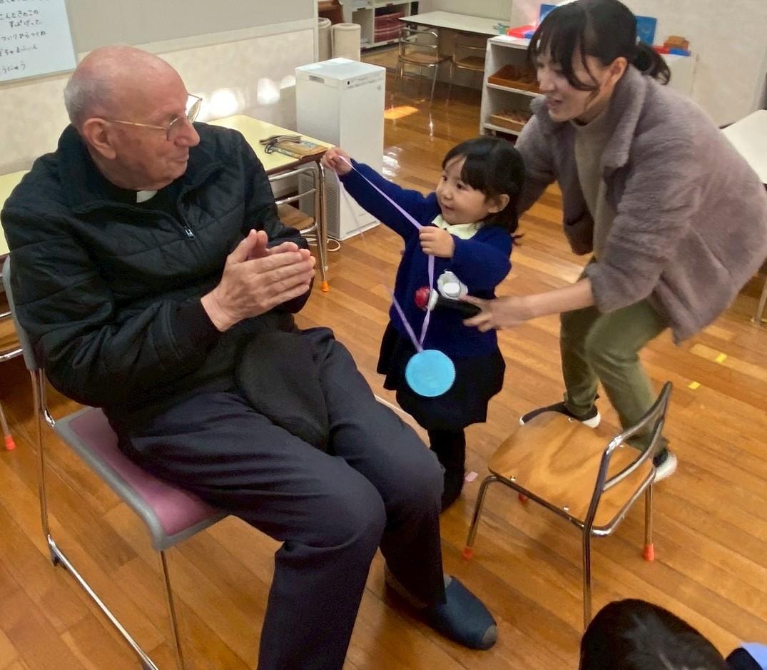 これまで、子ども達、職員、そして保護者の方に神様のお話をしてくださったり、時にはマジックをしてくださるとっても優しい神父様。アフリカやカンボジアの子ども達のためにもたくさん力を使ってこられた方です。いつも、「先生、僕も幼稚園の園児にしてくれる?」と笑顔で聞いてくださる神父様。