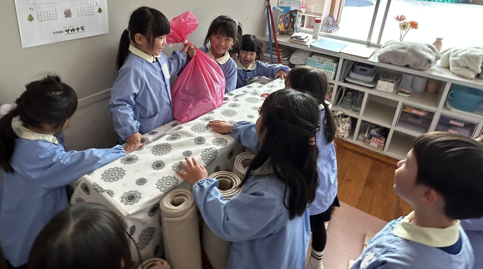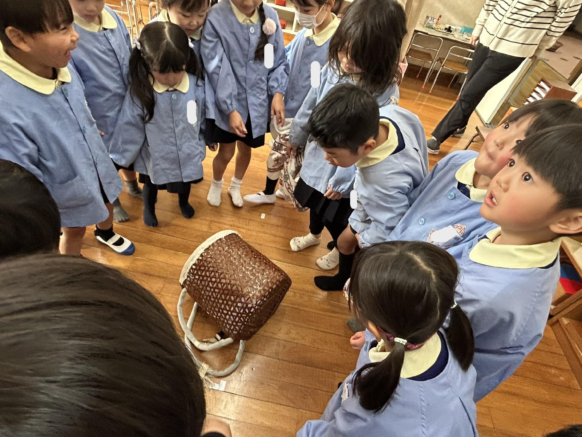ちゅうりっぷ組では、劇で使ったカゴの中にあると思いカゴの中を見ましたが、プレゼントが入っていないので、もう一度探し、棚の上にあるのを発見し喜んでいました。