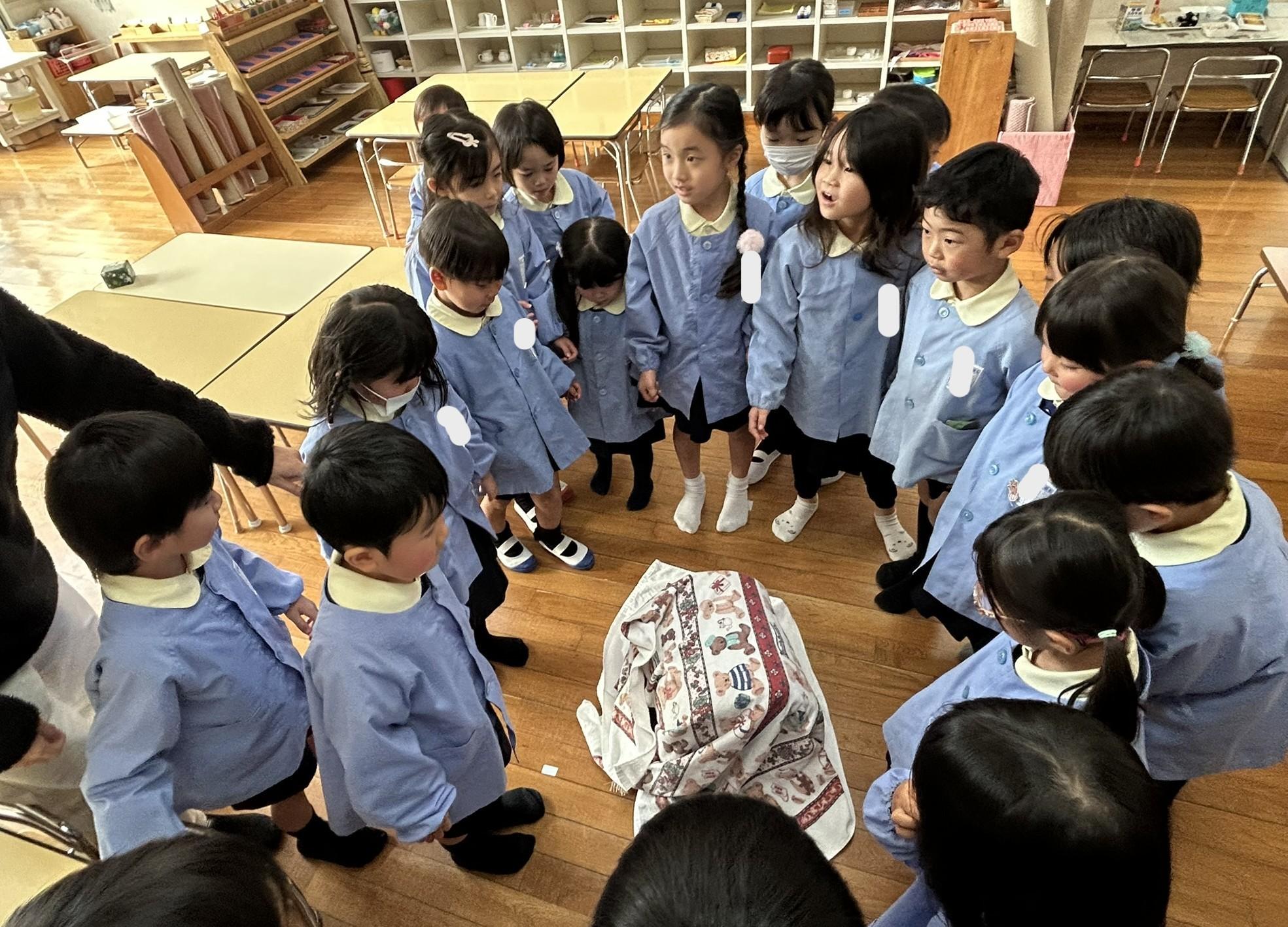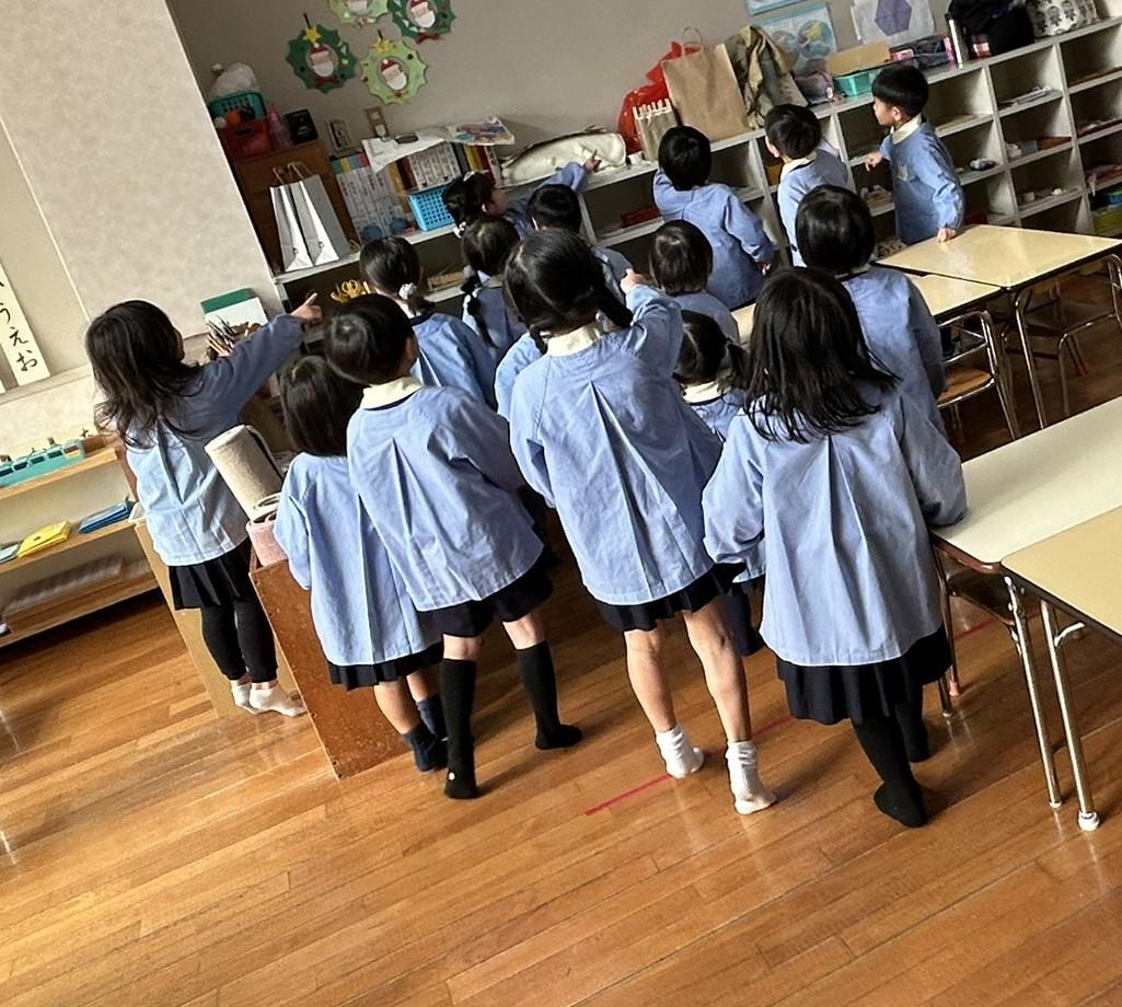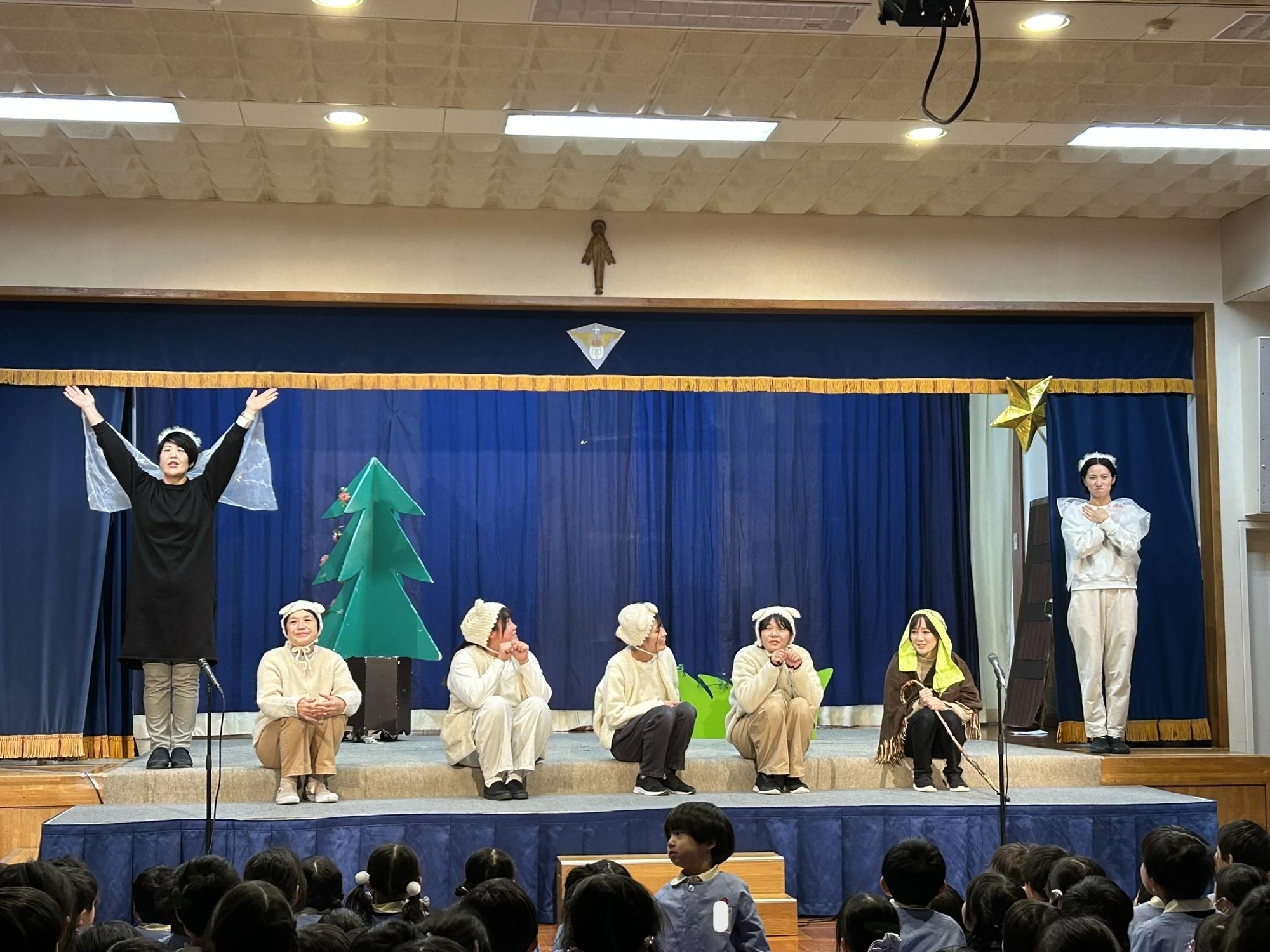 まず、先生達の”クリスマスのお話”の劇を見ました。それぞれ、先生達が何の役をしたか、皆よく見ていたようで、外遊びの時に、「○○先生、博士だったね。宿屋さん面白かったね。」など、子ども達同士で話していたり、職員に話している子ども達が沢山いました。