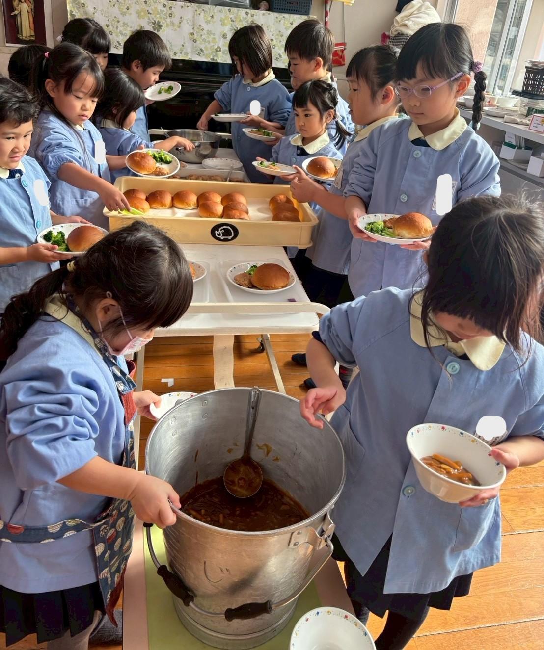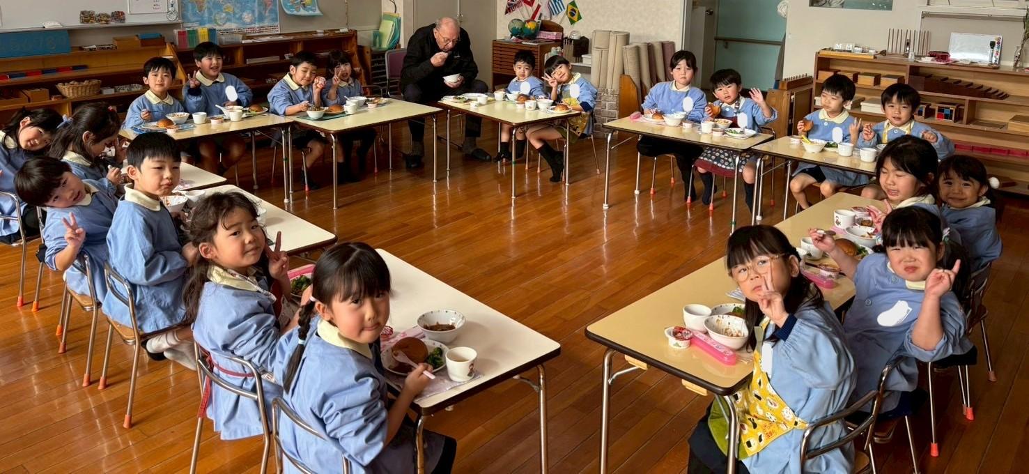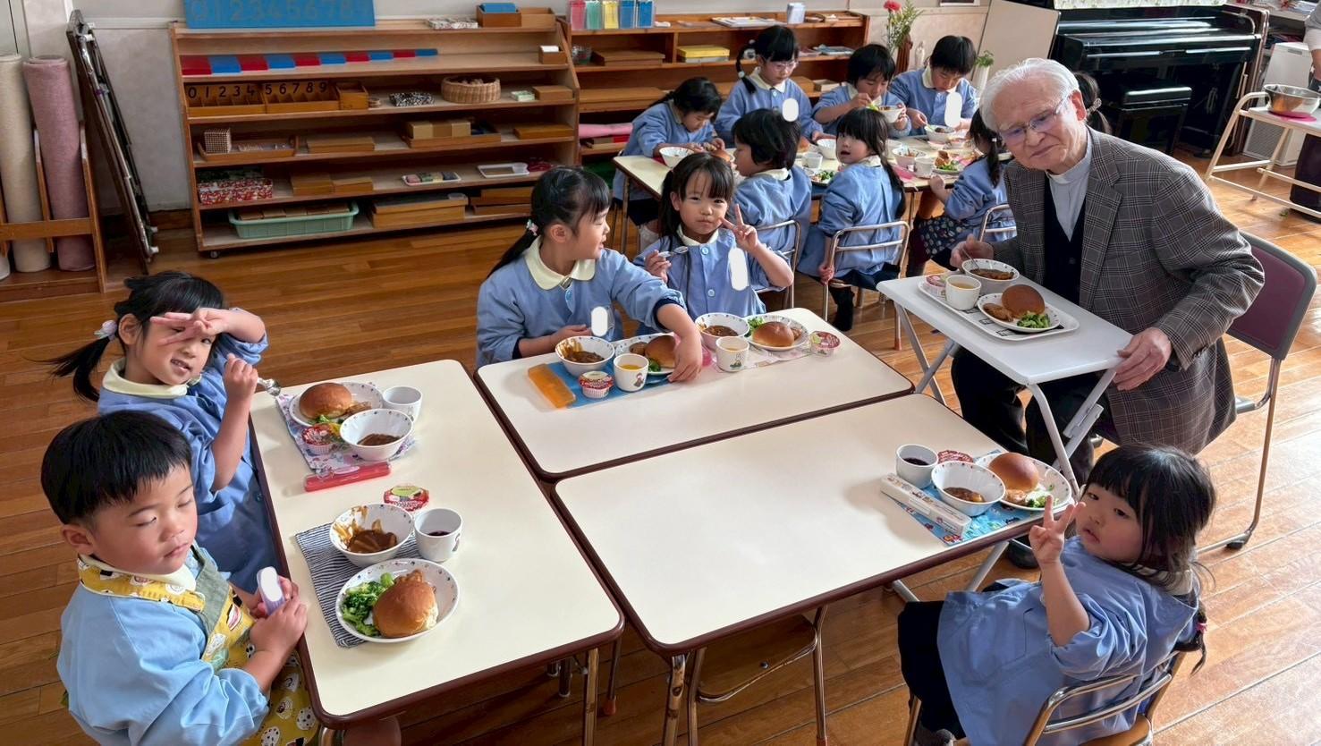 この日は、片柳神父様、外川神父様、ヴィタリ神父様も子ども達と一緒に給食の時間を楽しんでくださいました。また、職員室の先生も、子ども達と一緒に食べました。