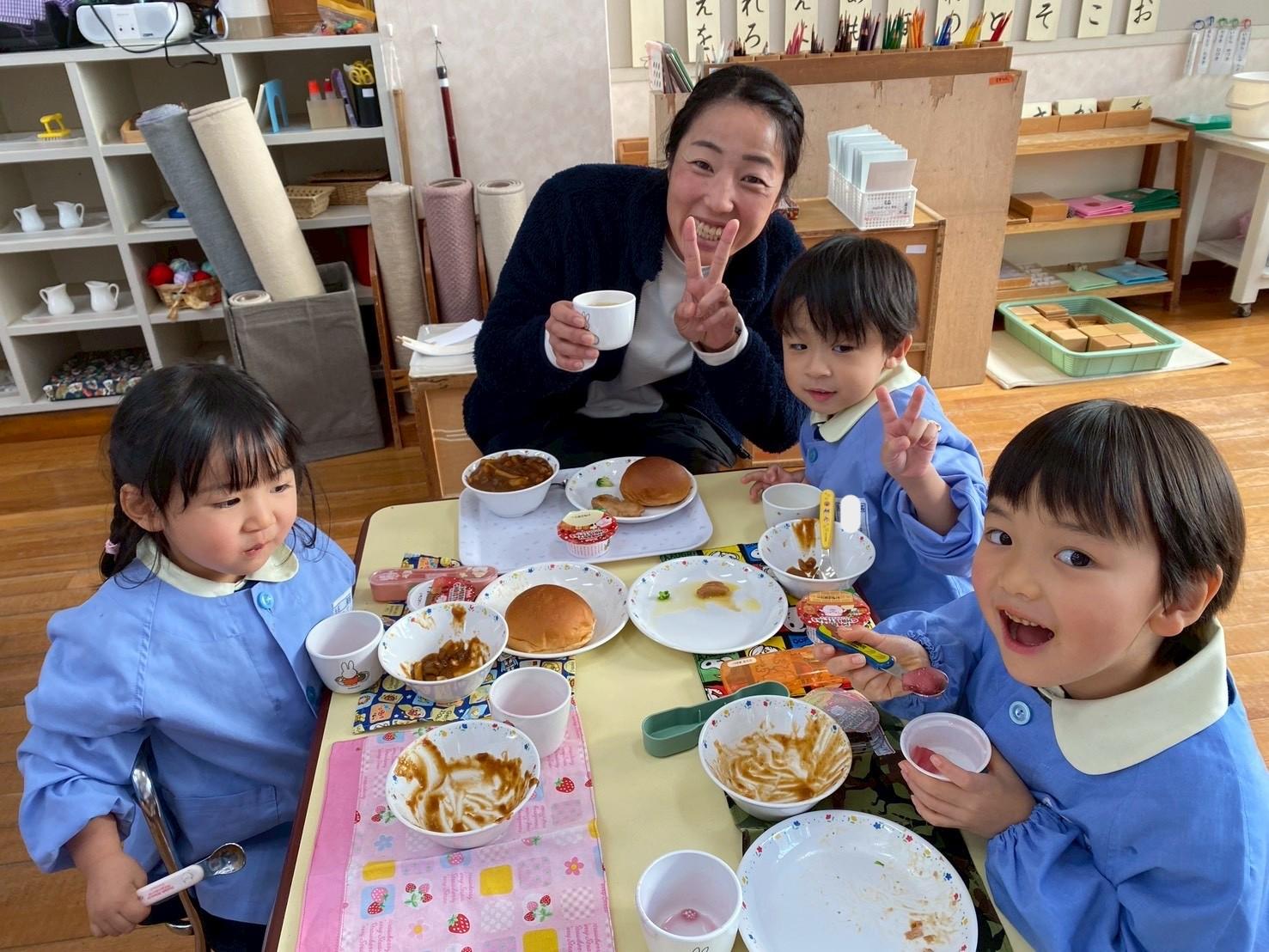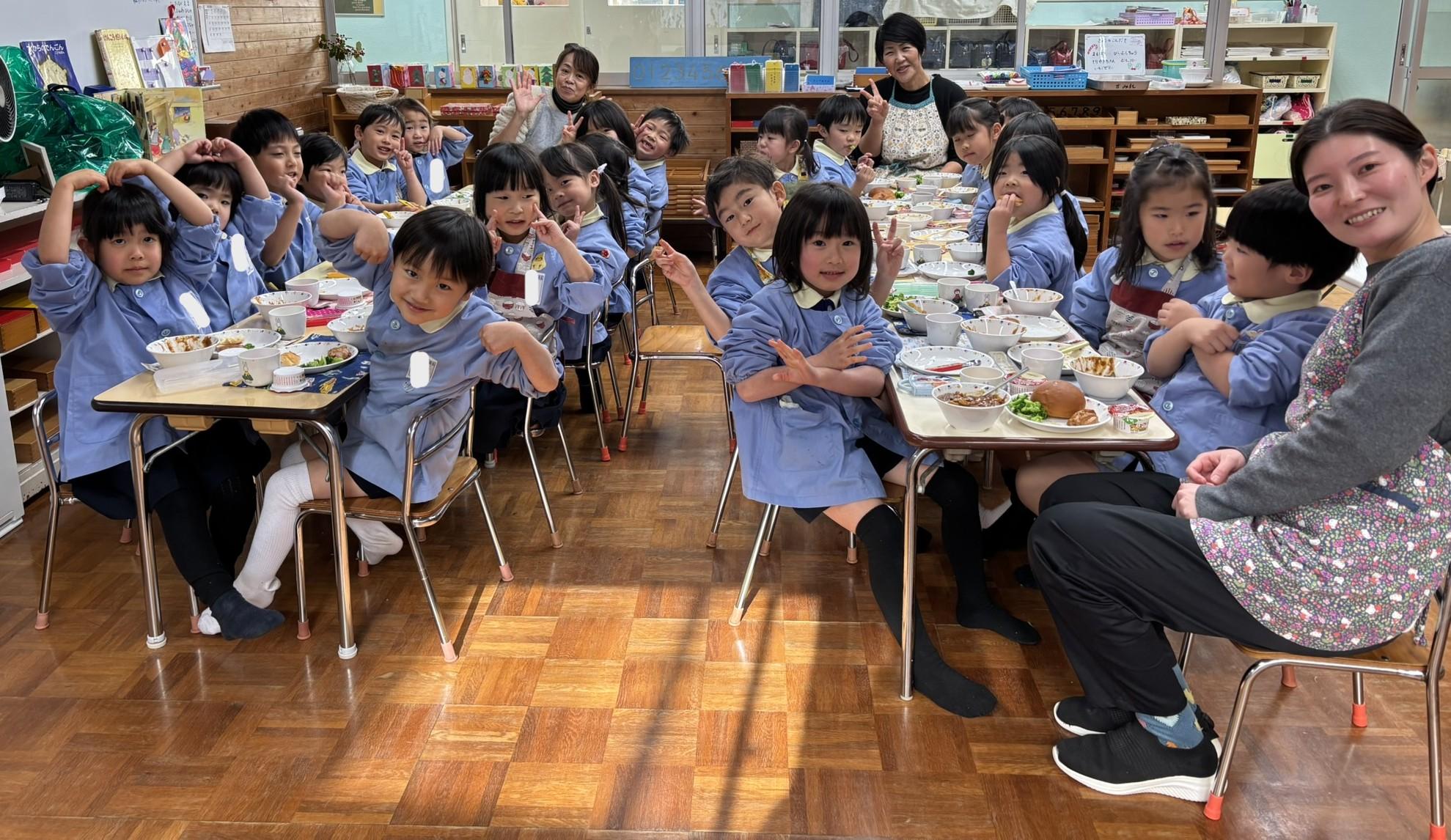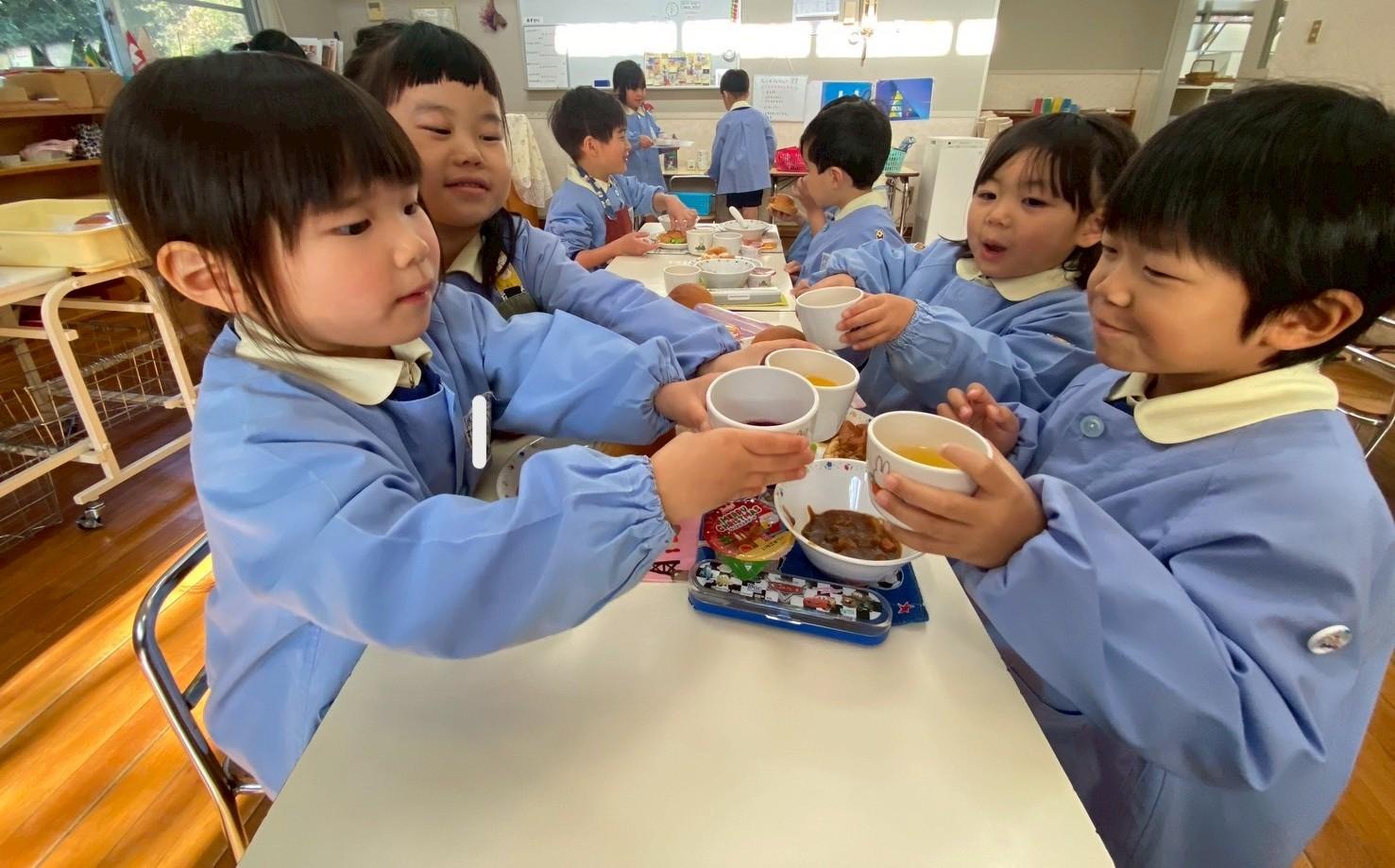 この日は、片柳神父様、外川神父様、ヴィタリ神父様も子ども達と一緒に給食の時間を楽しんでくださいました。また、職員室の先生も、子ども達と一緒に食べました。