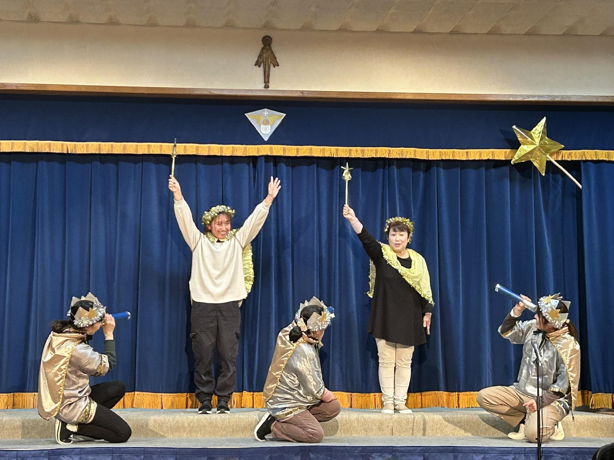 子ども達はホールに集まり、侍者の子ども達がロウソクとお花をイエス様にお捧げし、片柳神父様のお話を聞き、奉献の子ども達が皆の頑張ったお約束カードをお捧げする"クリスマスページェント"をしました。