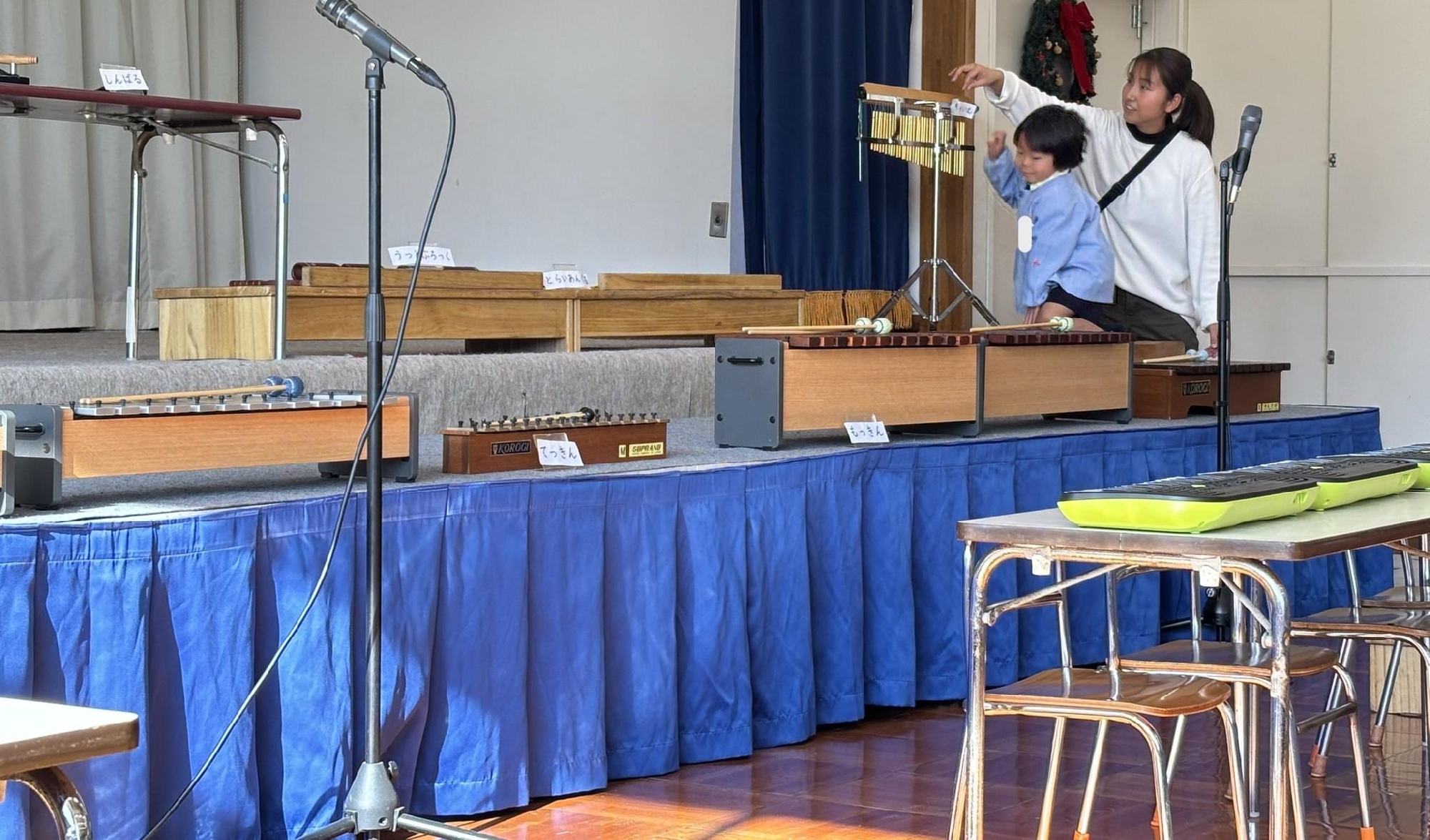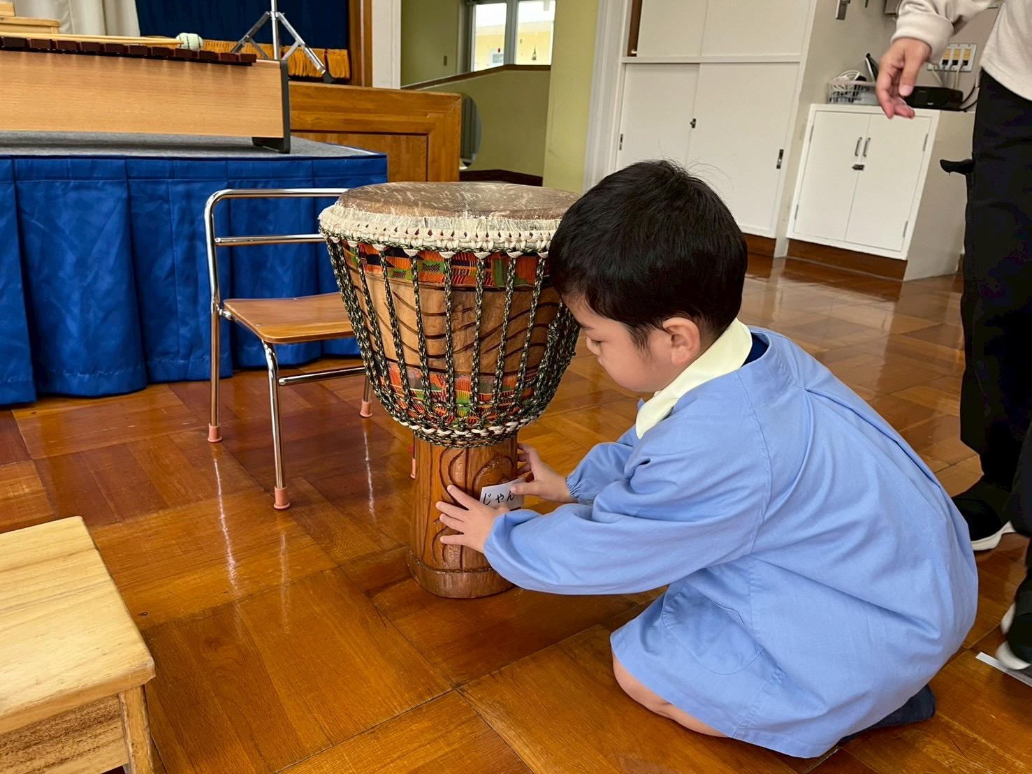 年長児がしていたように木琴でグリッサンドしたり、ウインドチャイムを鳴らしたり、嬉しそうにジャンベをたたいたり…