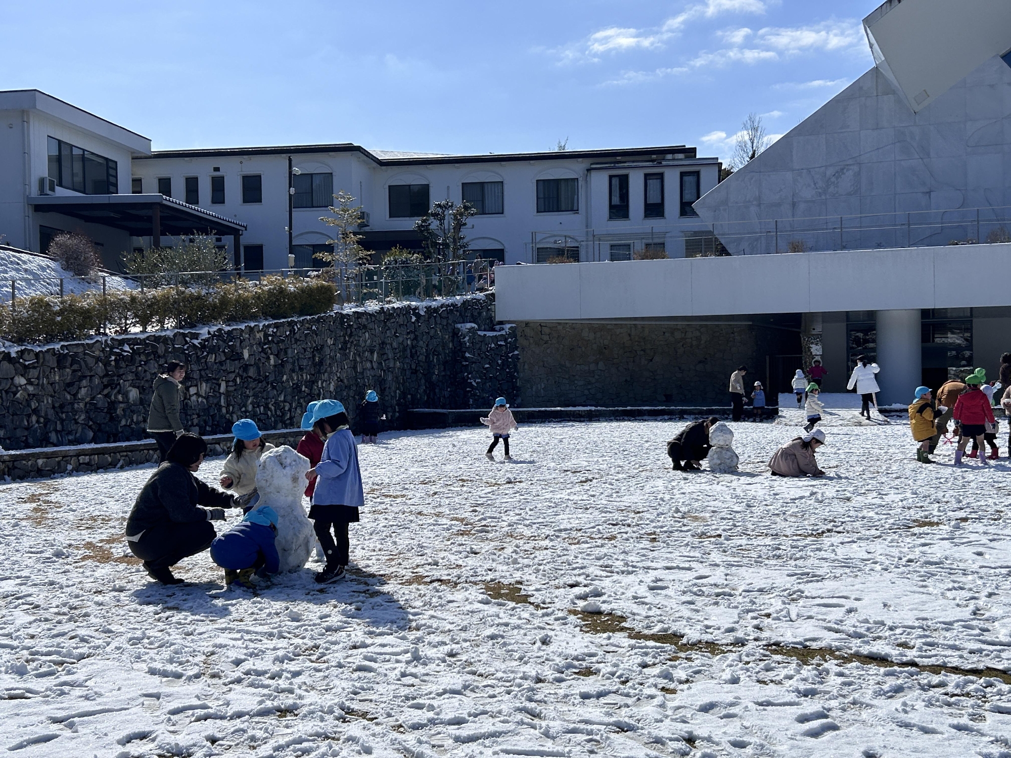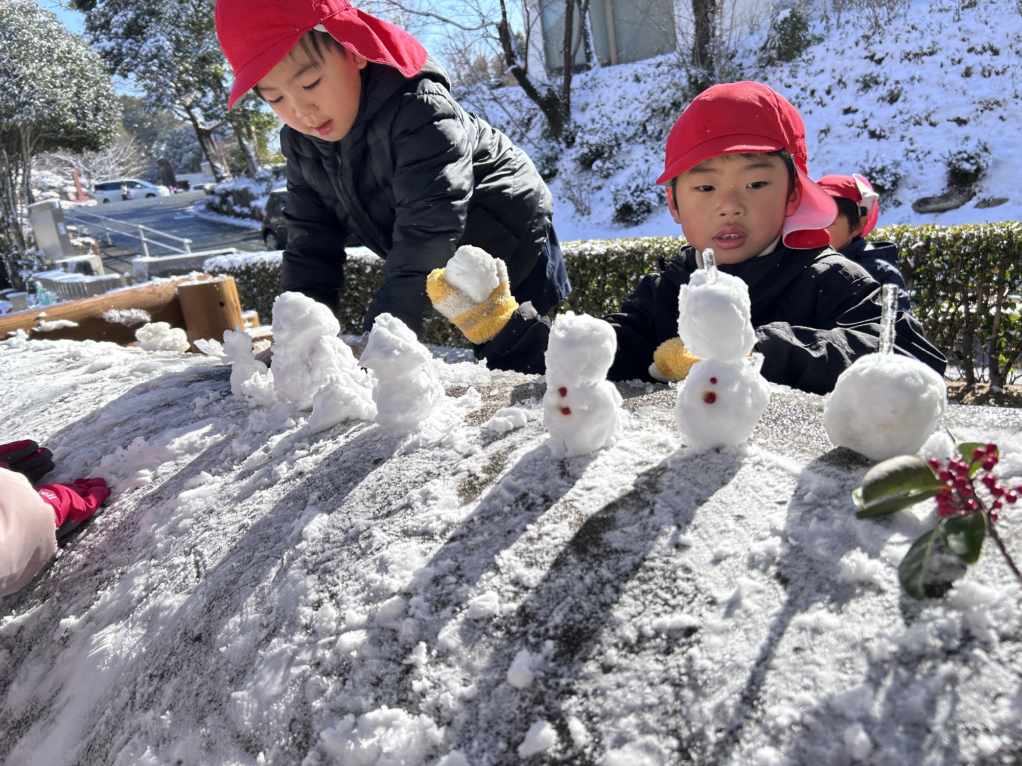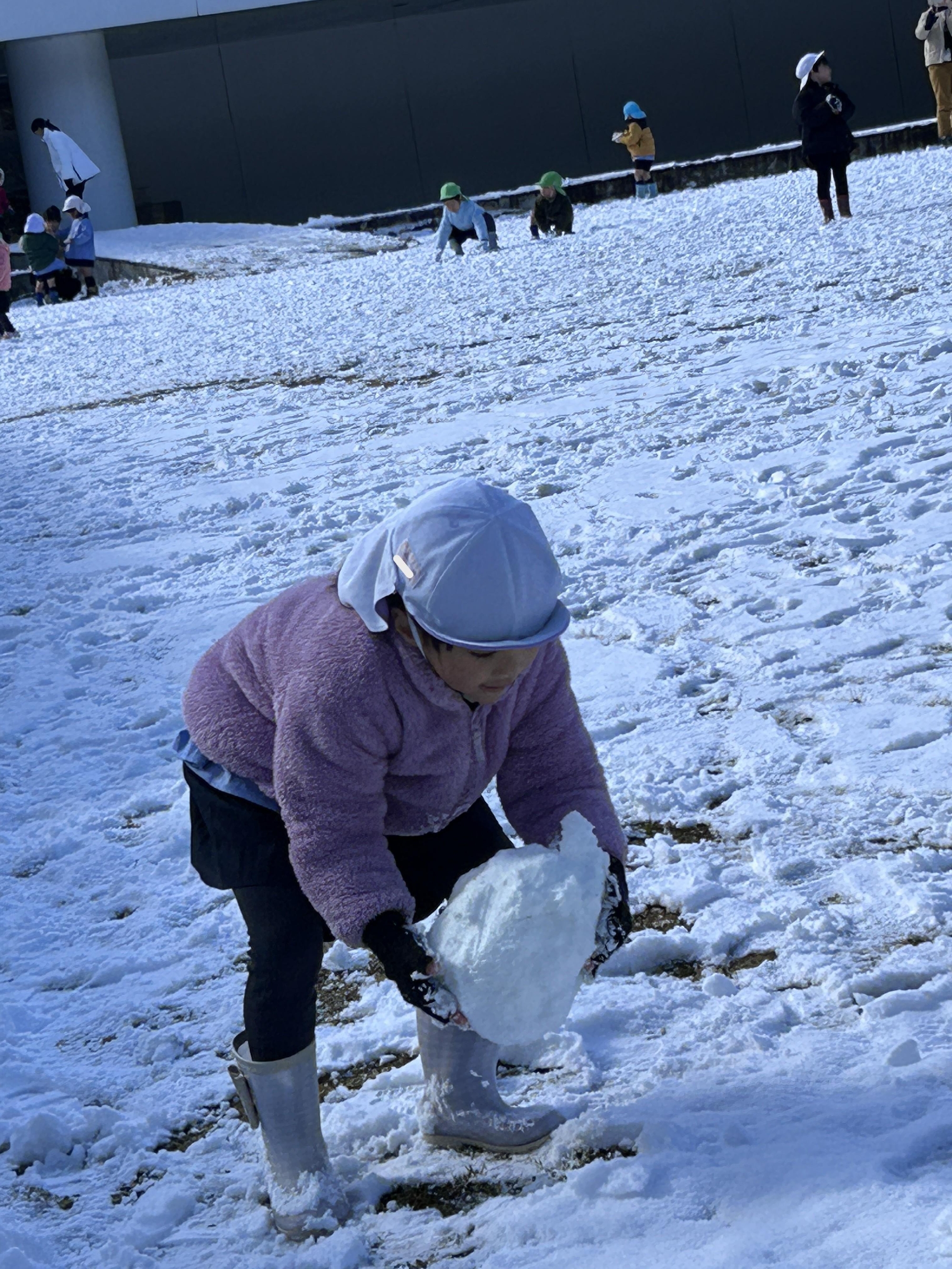 幼稚園では、寒さに負けず、芝生や園庭の雪で雪遊びをしました。
