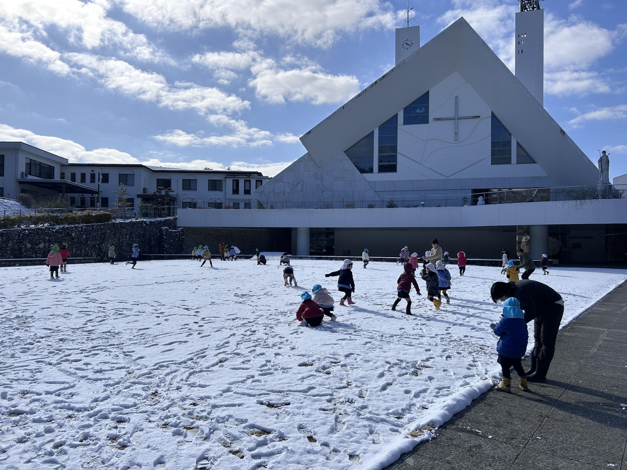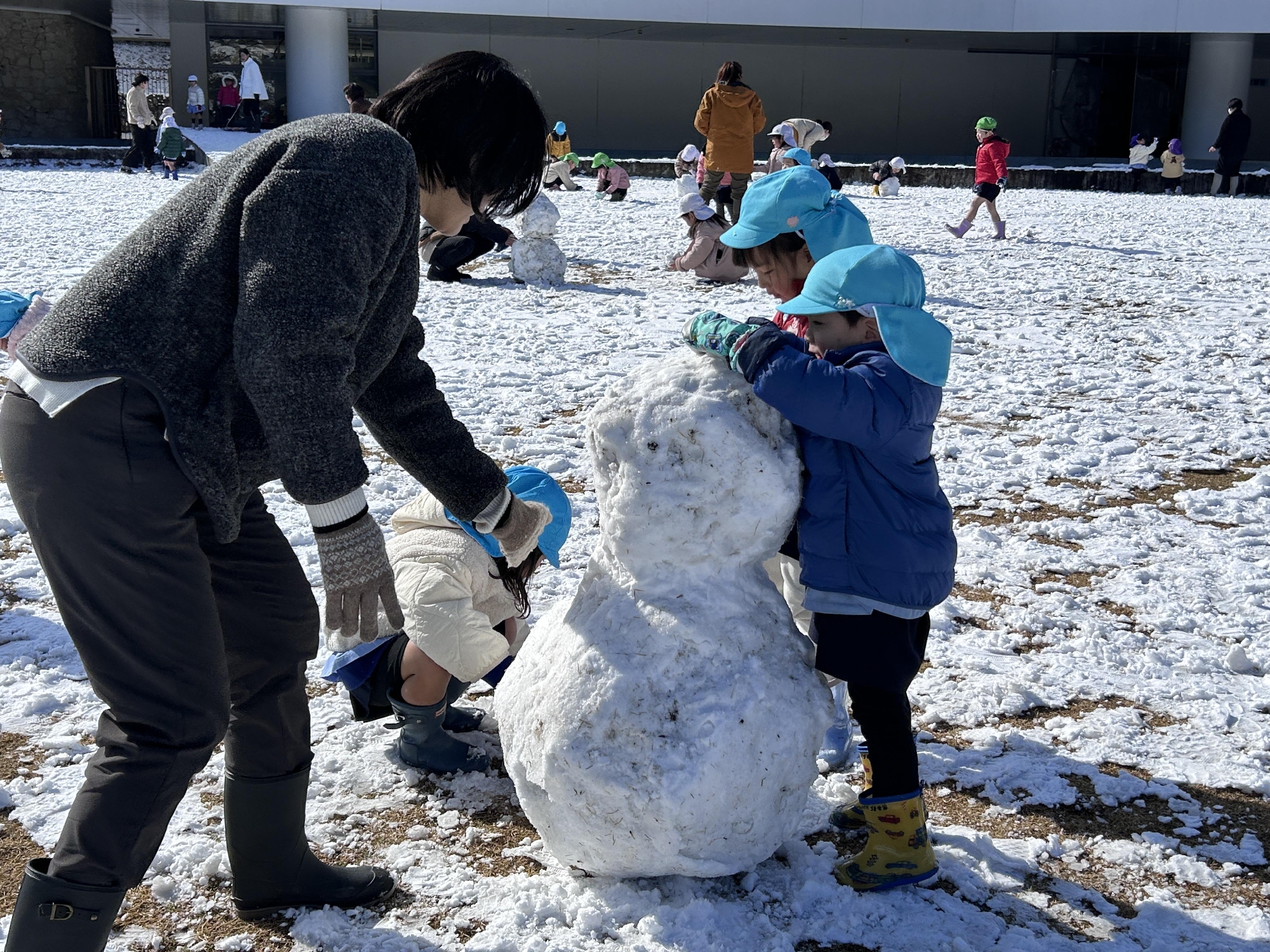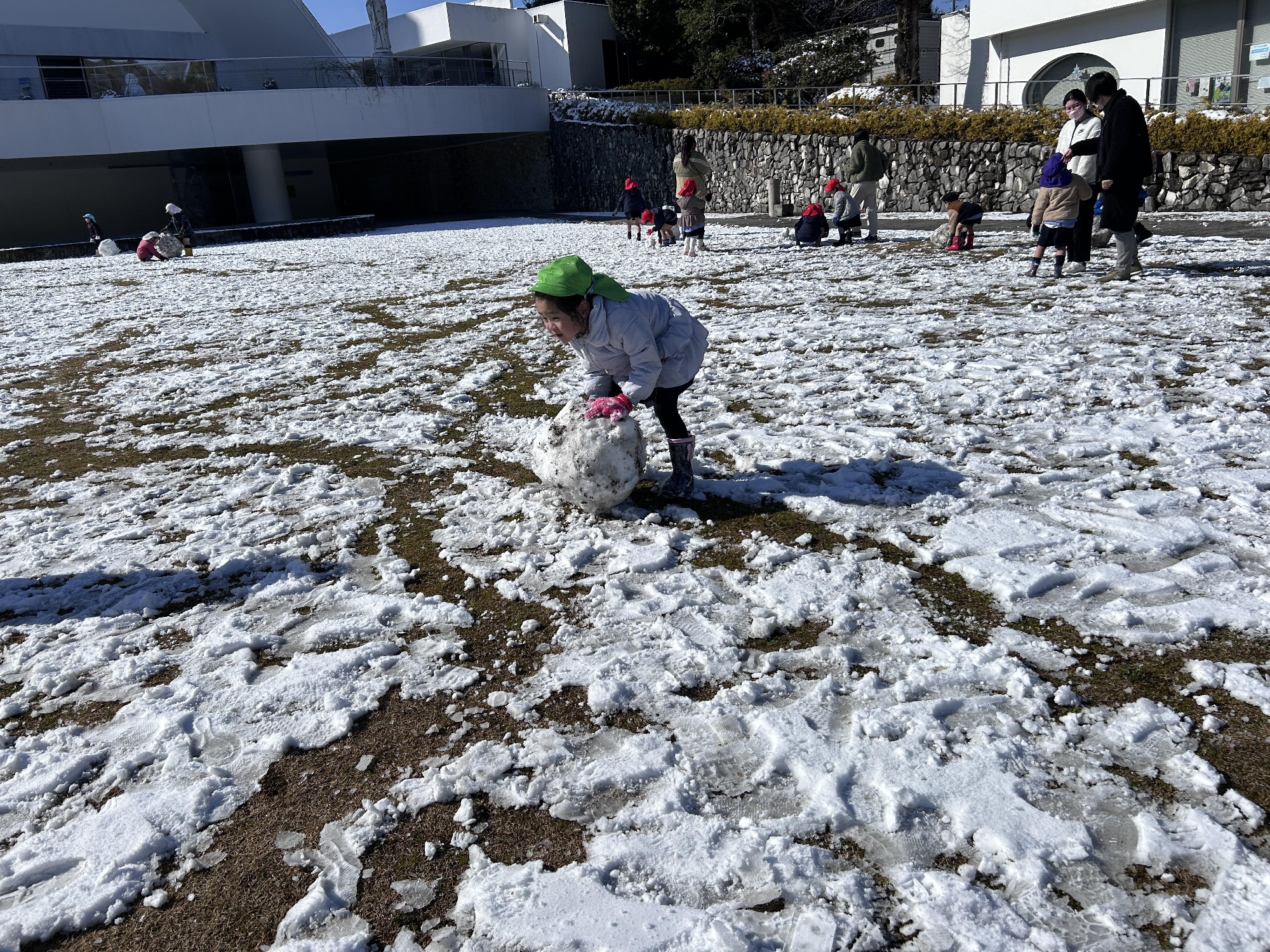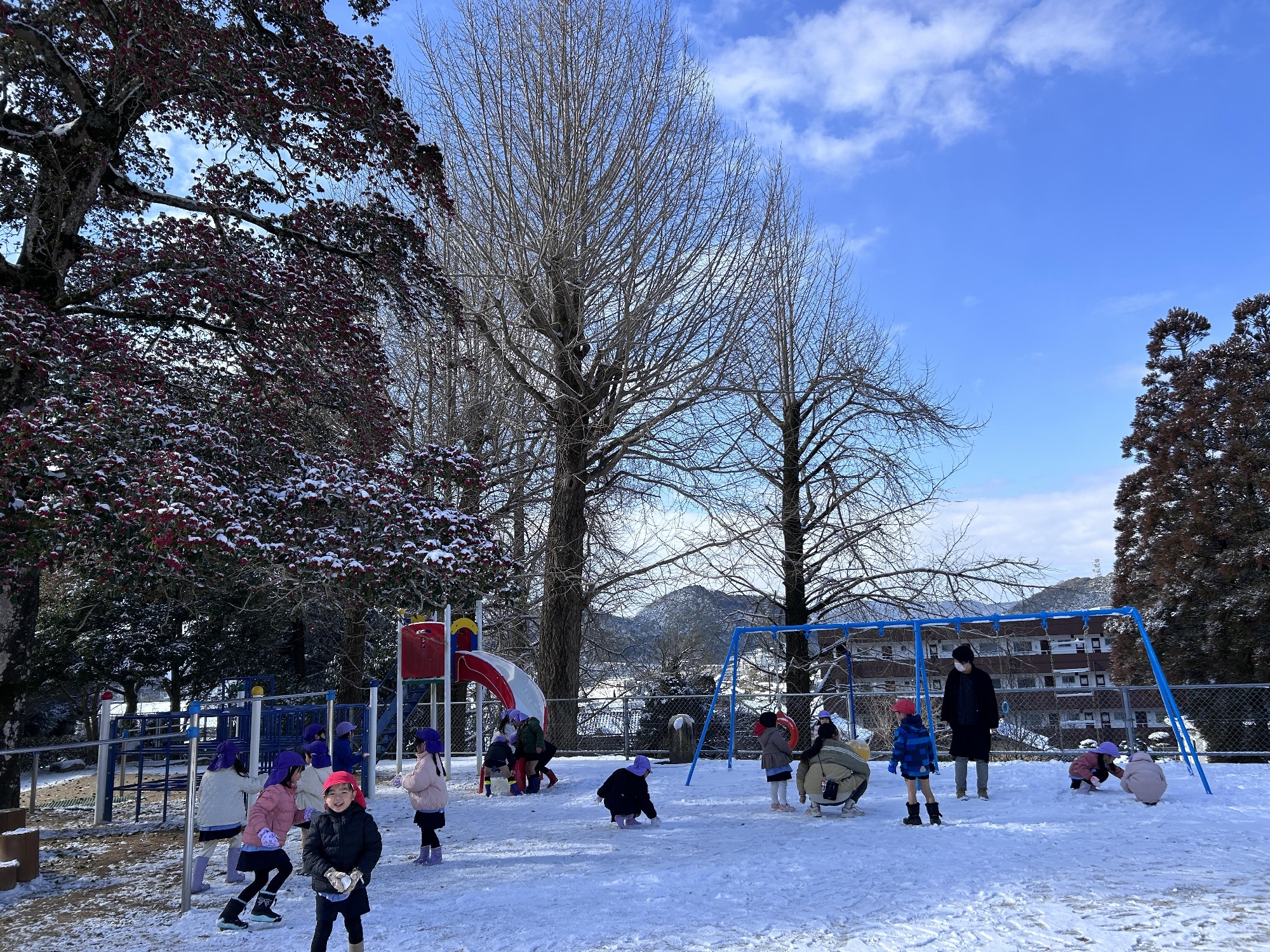 幼稚園では、寒さに負けず、芝生や園庭の雪で雪遊びをしました。