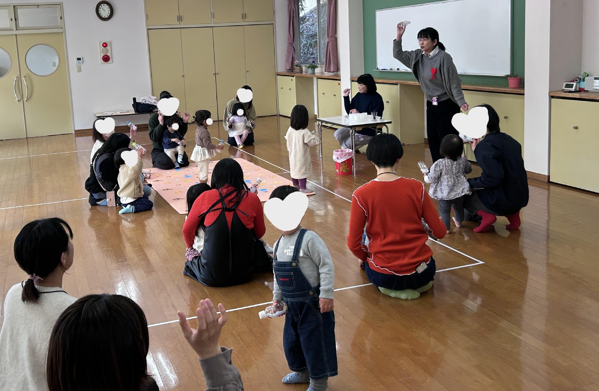 読み聞かせや親子体操、ペットボトルでマラカス作りをしました。