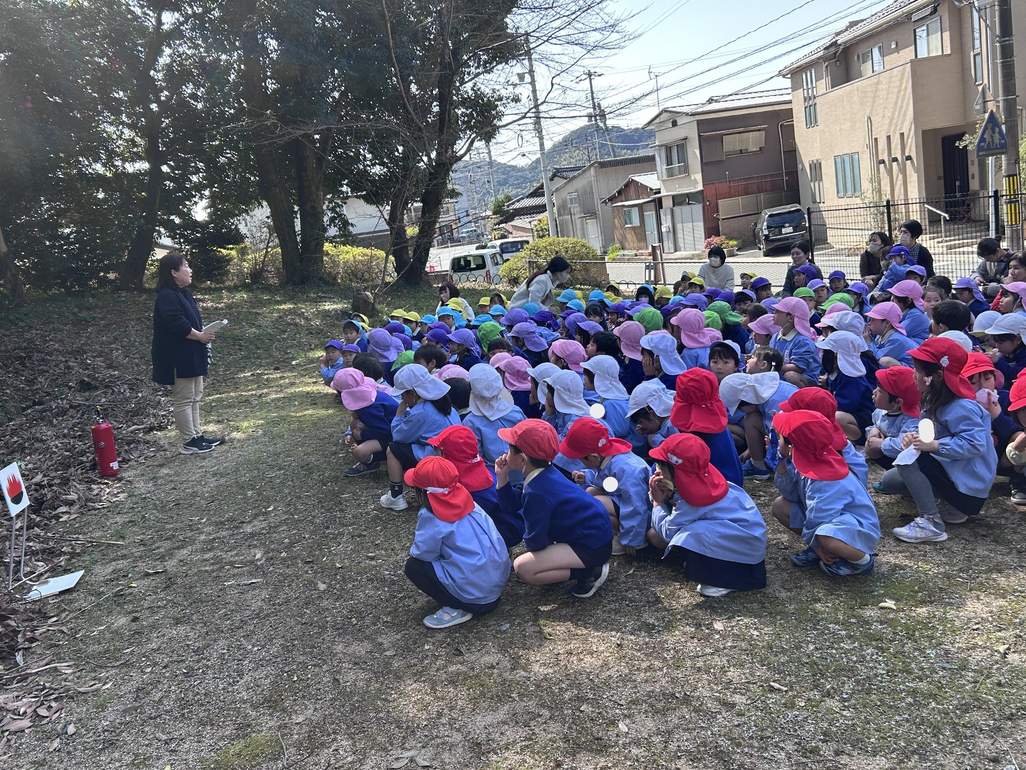 職員室が火事になった設定で、みんなですずらん組坂道を降りたところにある空き地に避難をする練習をしました。