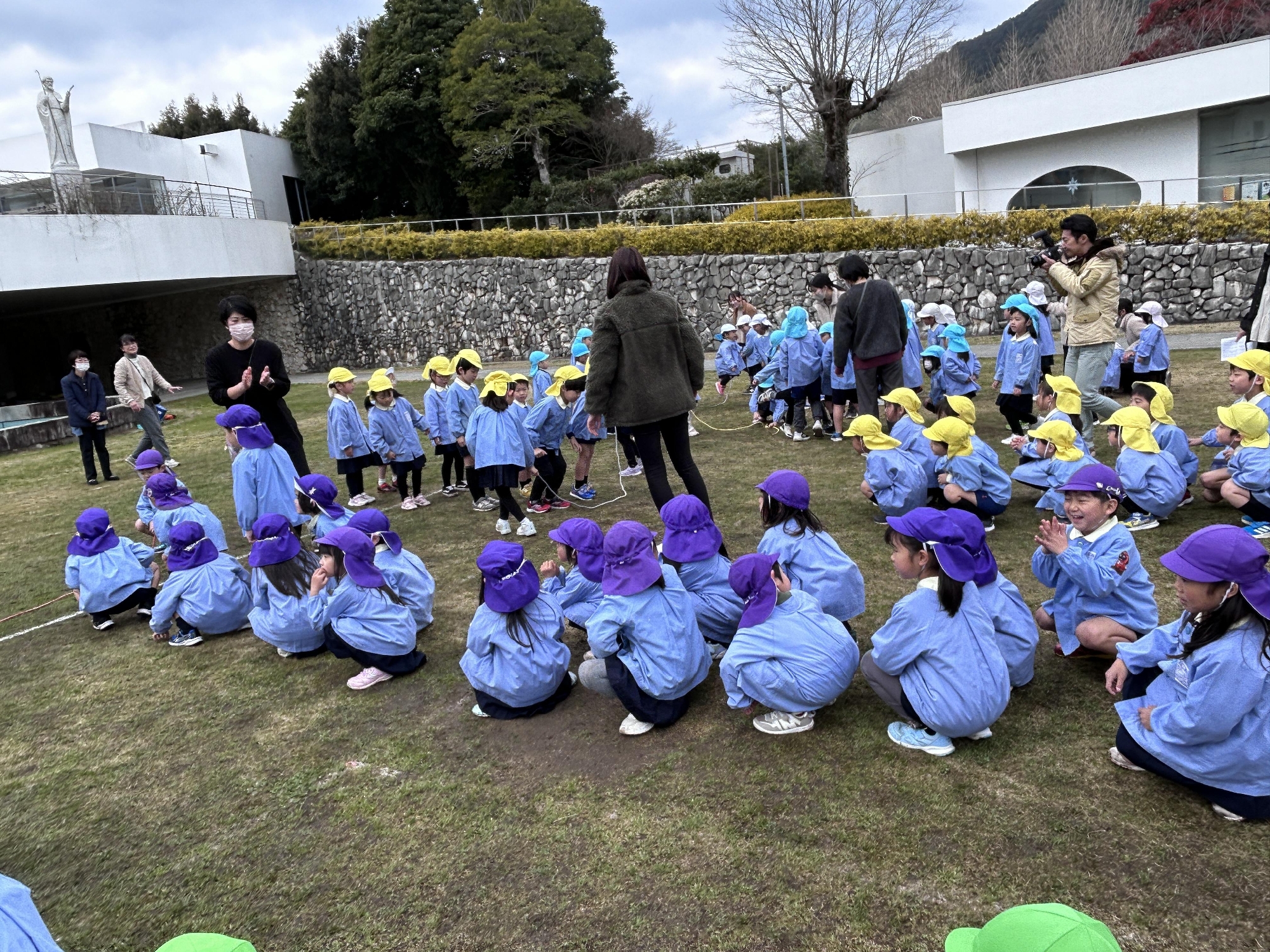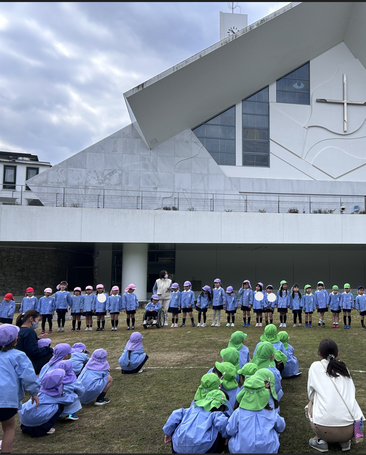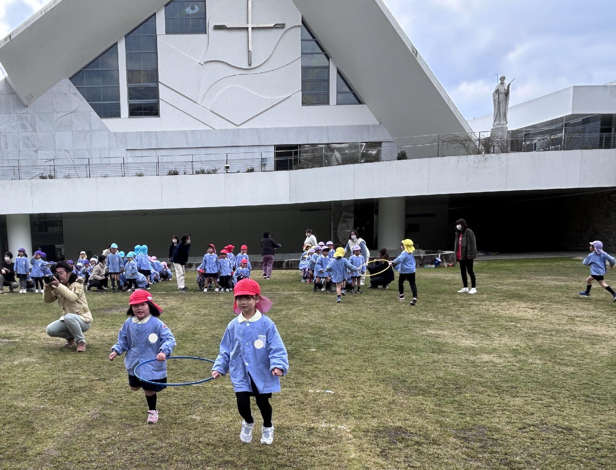 神様に見守られながら、教会の芝生で楽しい時間を過ごしました。