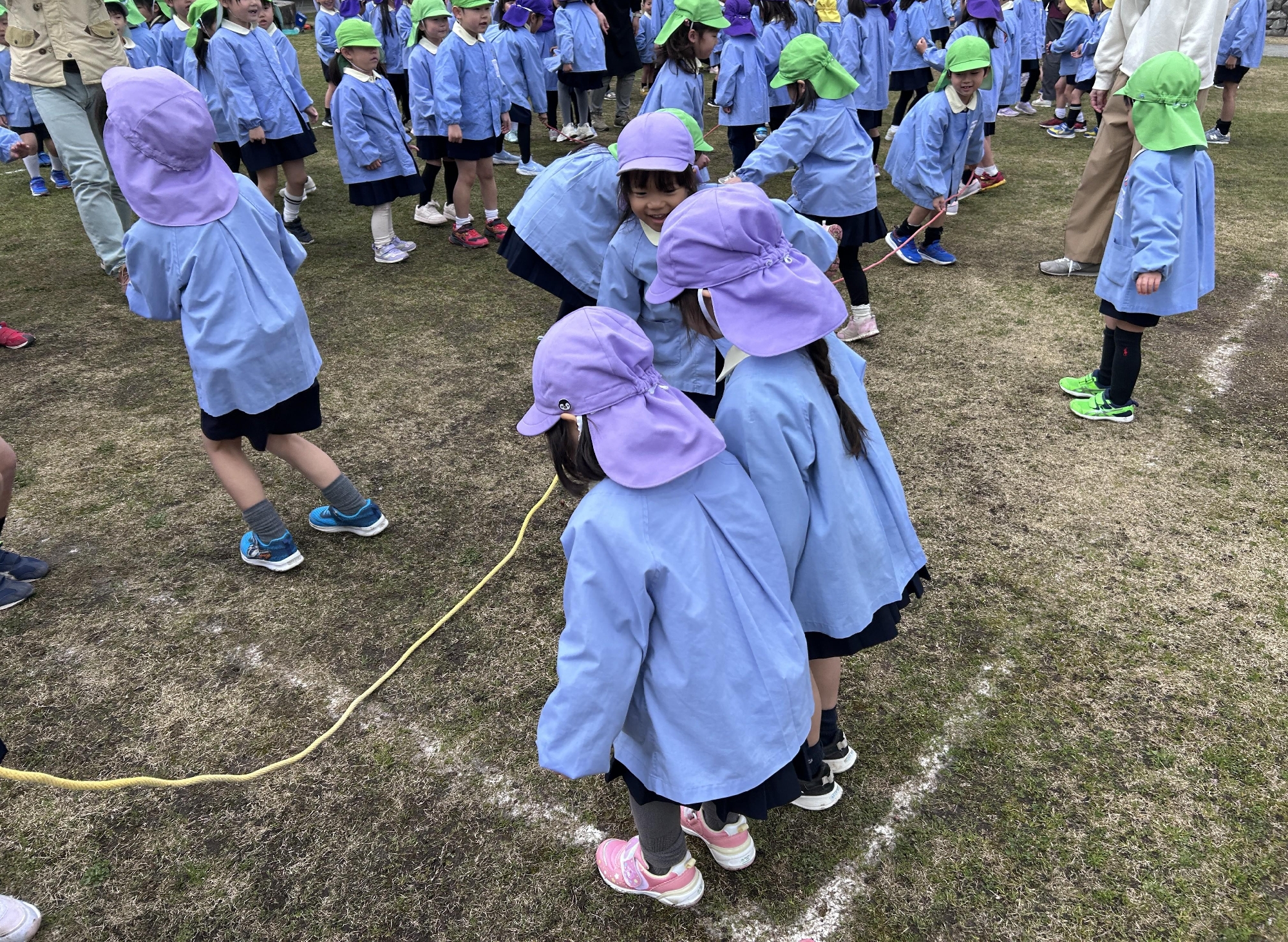 2人が縄を持ち、その縄を跳び、跳んだら後ろを向いて待ちます。すると最後まで行った縄がまた帰ってきて、前まで戻ったらゴールという競技でした。