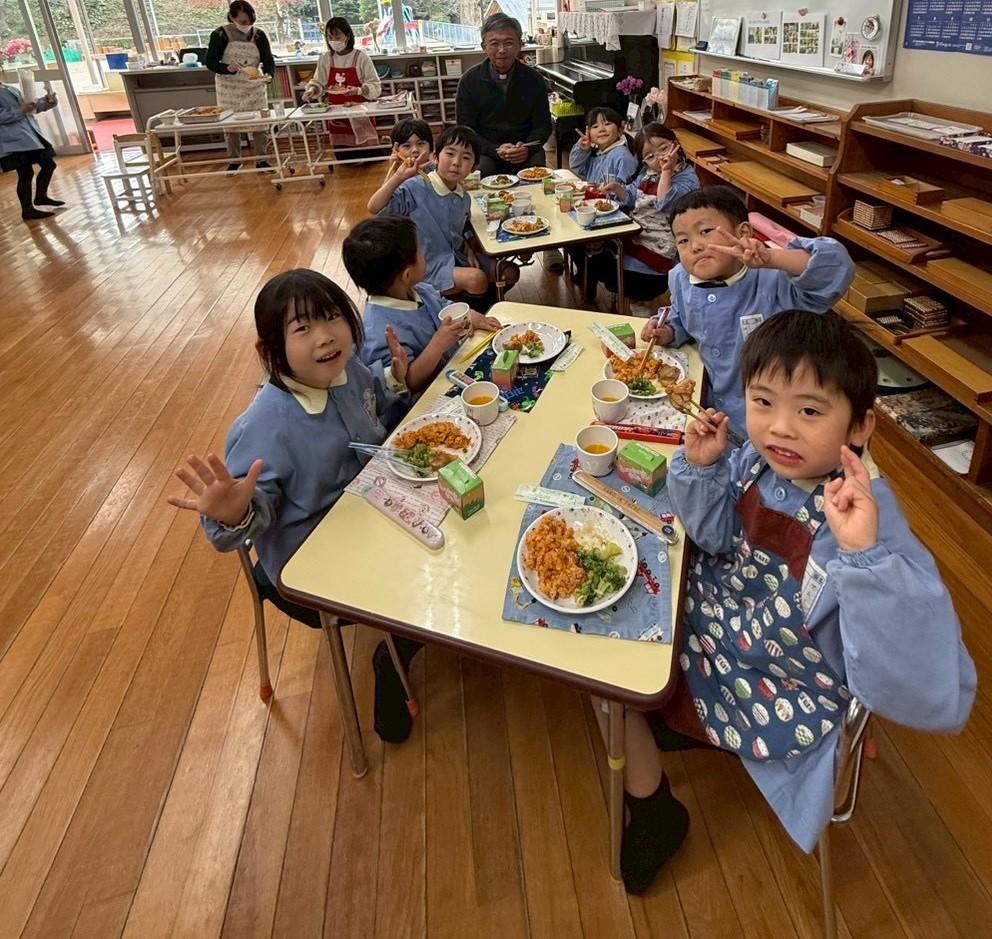 「おいしすぎる~!!」「サイコー!!」「神父様が来てくれて嬉しい!!」みんなとってもおいしそうにたくさん食べました。